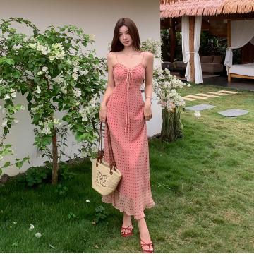 BY18344# 夏季新款日暖橘波点裙纯欲法式中长款吊带连衣裙海边度假裙 服裝批發女裝批發服飾貨源