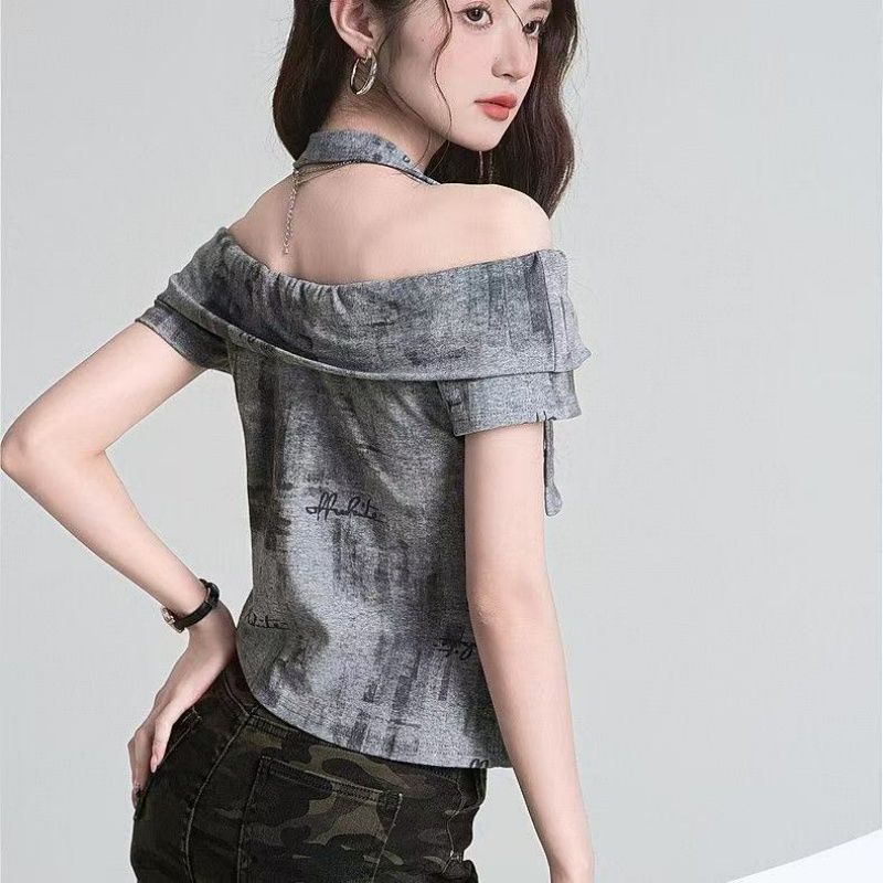 BY18383# 美式辣妹风穿搭扎染一字肩短袖t恤女夏季御姐设计感收腰露肩上衣 服裝批發女裝批發服飾貨源