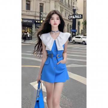 BY18388# 夏季上新轻奢通勤风蓝色V领修身收腰系带连衣裙时尚气质显瘦女装 服裝批發女裝批發服飾貨源