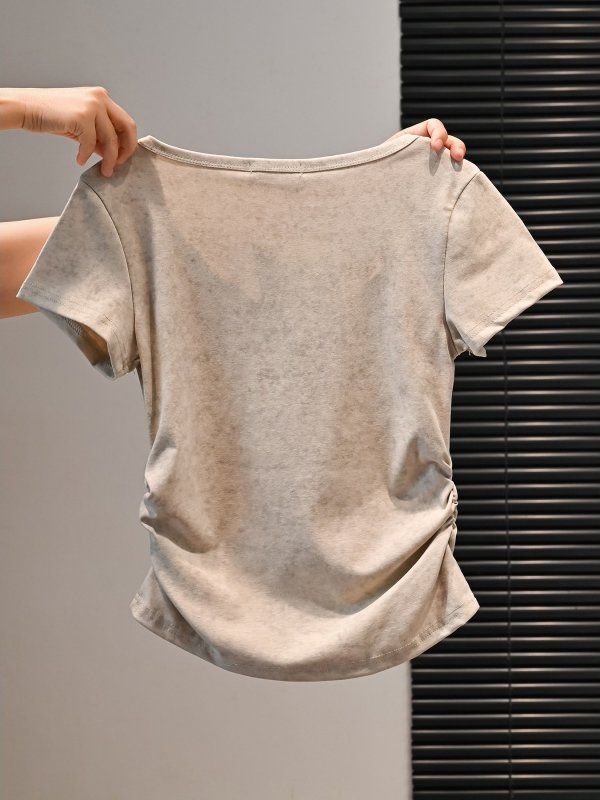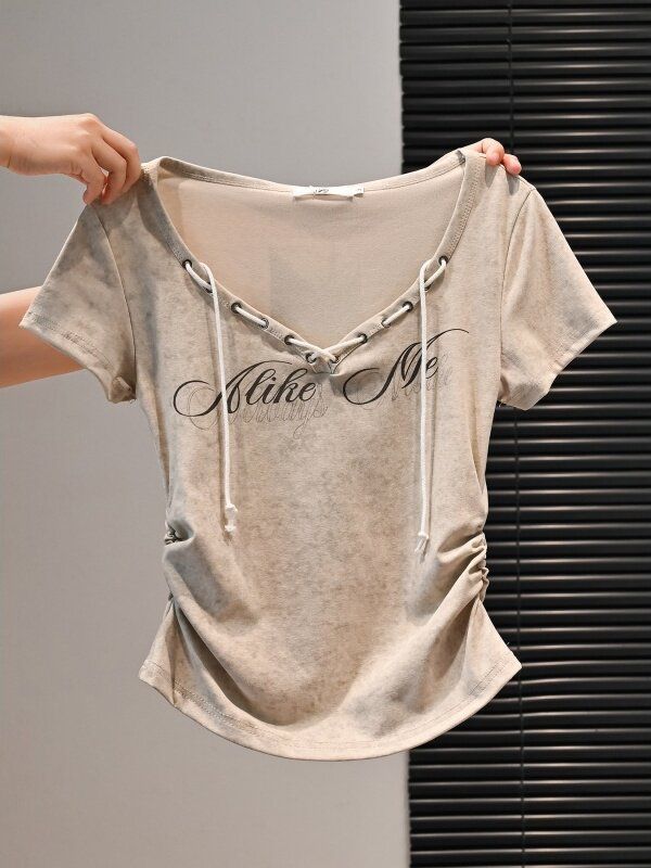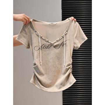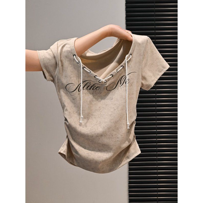 BY18391# 美式复古辣妹短款修身显瘦短袖t恤女夏收褶弧形字母印花系绳上衣 服裝批發女裝批發服飾貨源