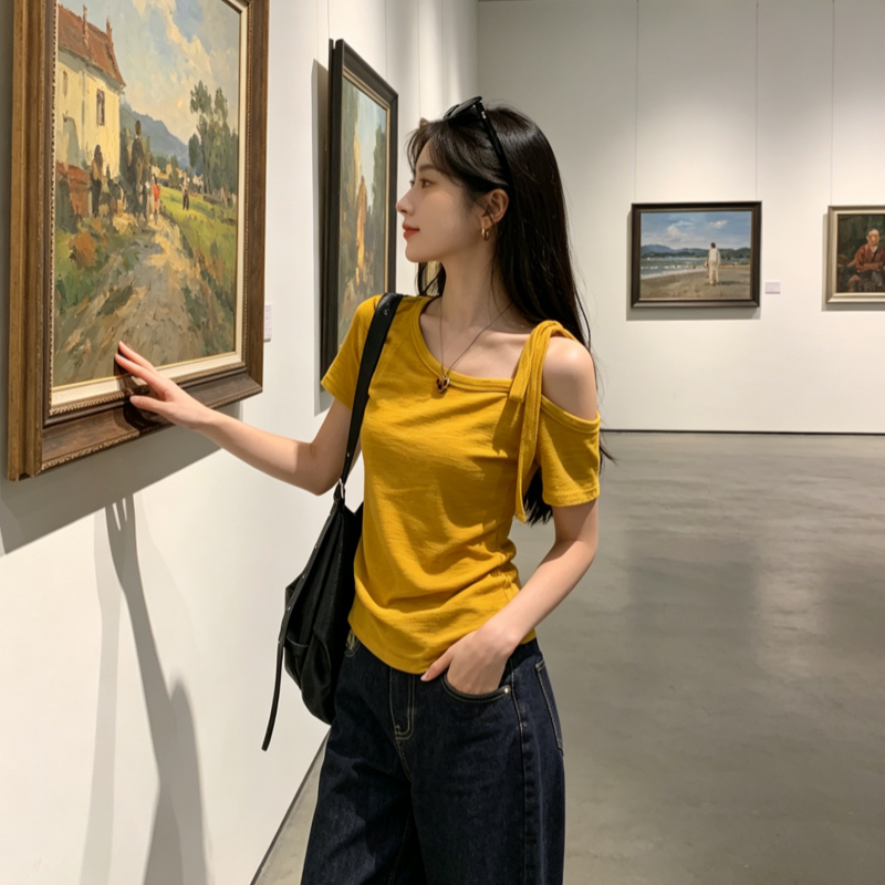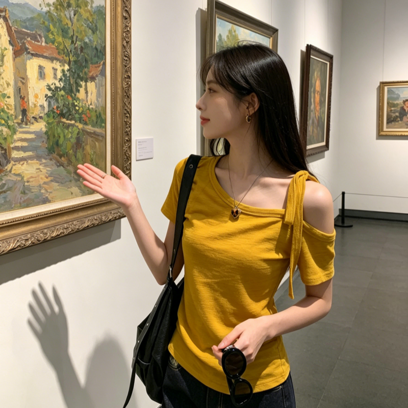 BY18453# 黄色斜肩短袖t恤女夏显瘦百搭露肩绑带设计辣妹上衣 服裝批發女裝批發服飾貨源