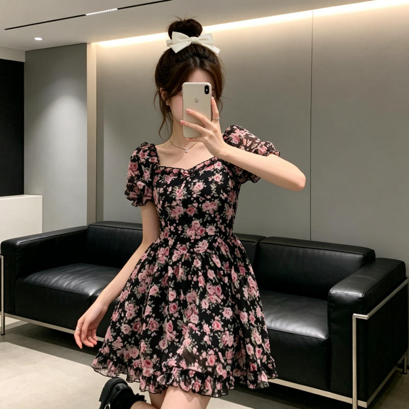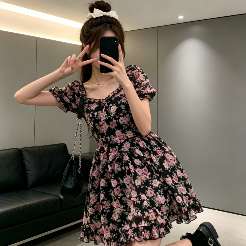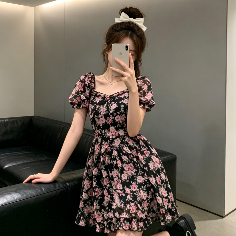 BY18464# 法式复古纯欲甜辣风初恋茶歇碎花连衣裙子女收腰气质小个子短裙夏 服裝批發女裝批發服飾貨源