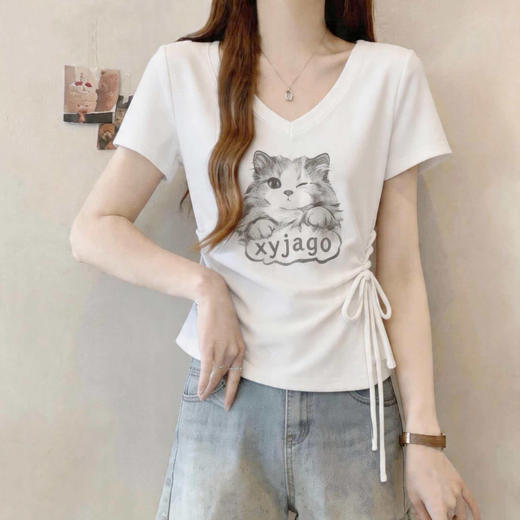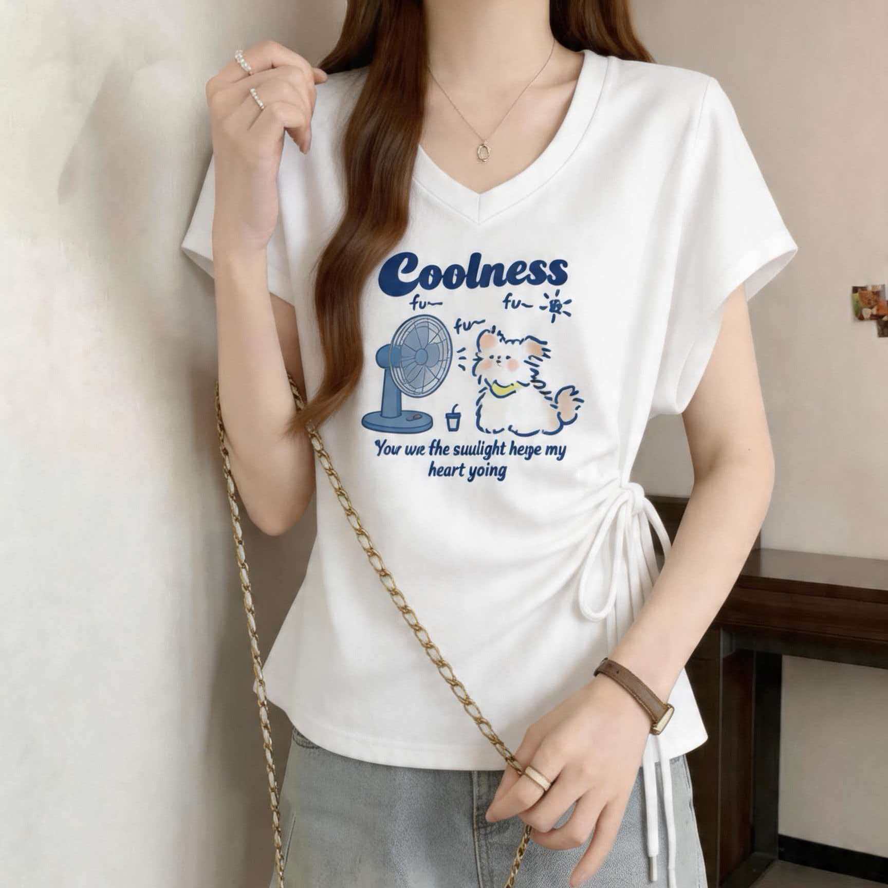 BY18477# 别致系带褶皱收腰短袖T恤夏季新款侧开叉修身显瘦v领上衣 服裝批發女裝批發服飾貨源