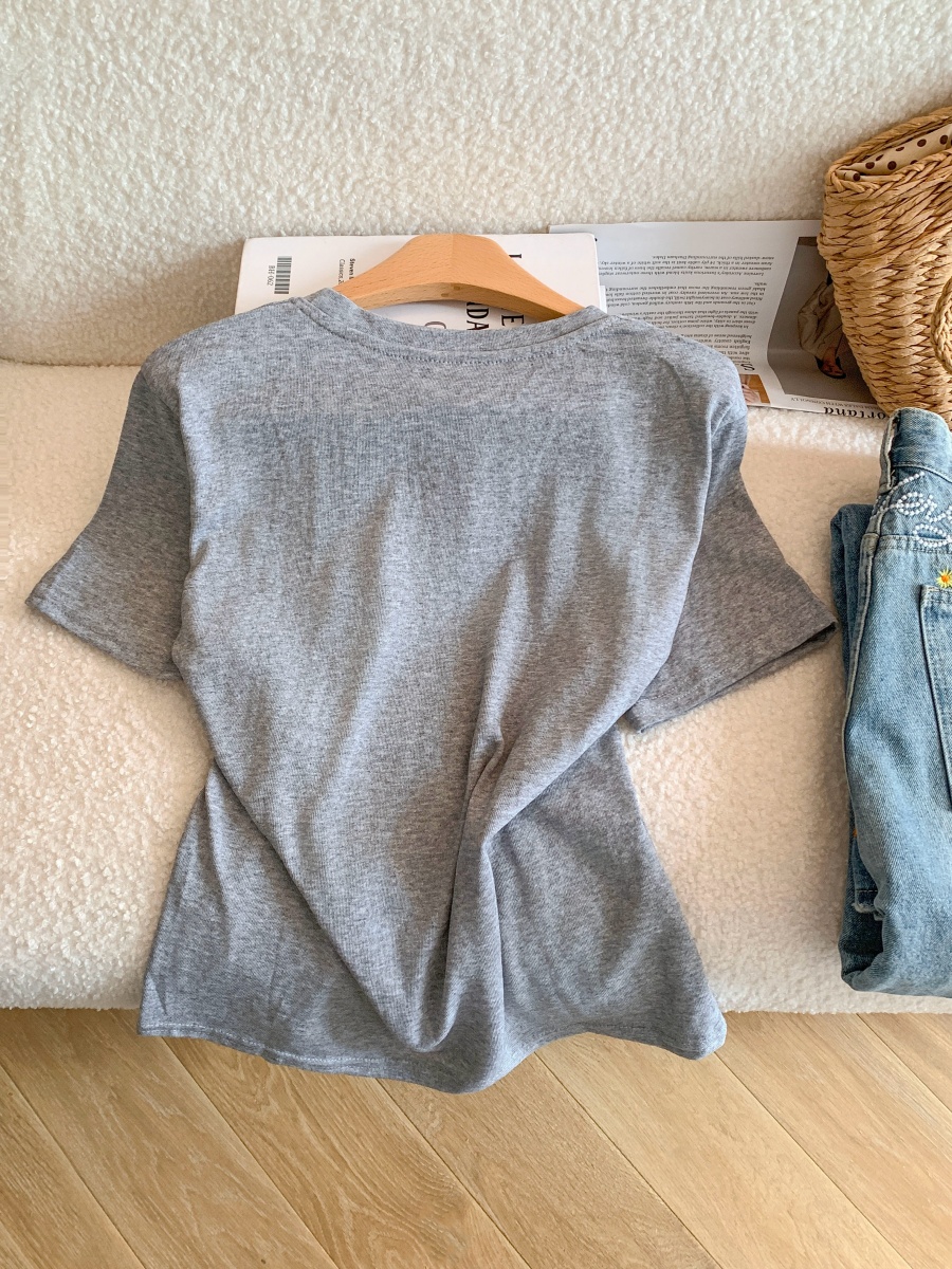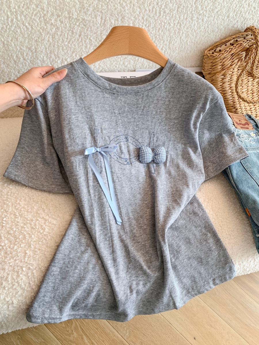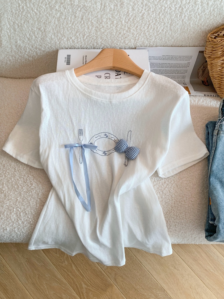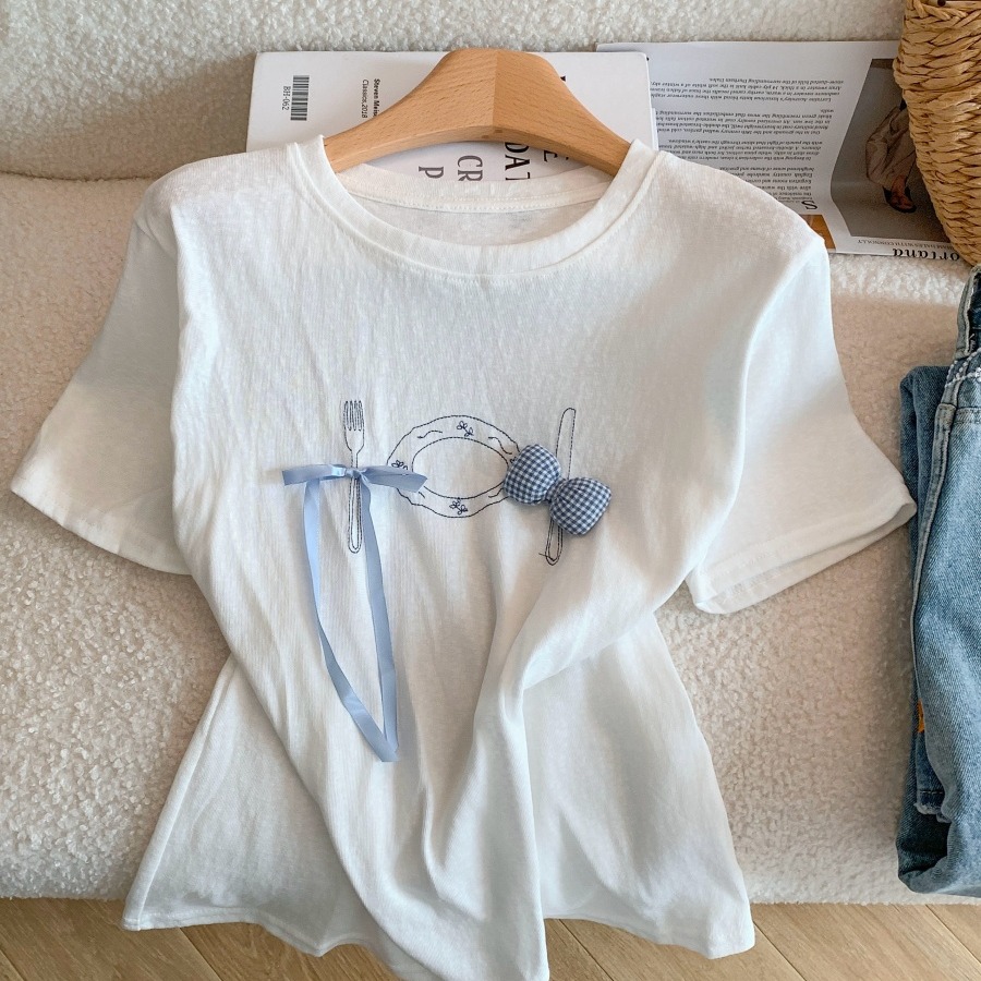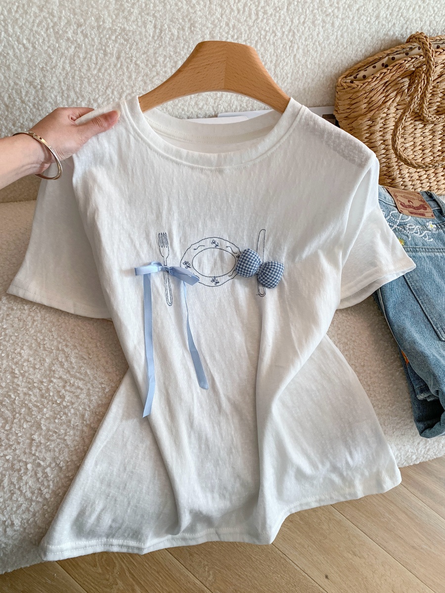 BY18499# 韩系设计蝴蝶结餐具雪花亚痳T恤女夏季新款显瘦百搭洋气短袖纯棉 服裝批發女裝批發服飾貨源