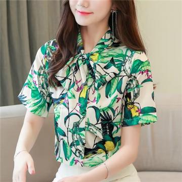 BY18609# 法式别致短袖碎花雪纺衫女夏季新款时尚百搭蝴蝶结系带衬衣 服裝批發女裝批發服飾貨源