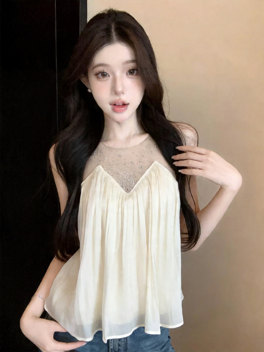 BY18680# 法式温柔网纱烫钻拼接无袖上衣女高级感修身显瘦上衣 服裝批發女裝批發服飾貨源