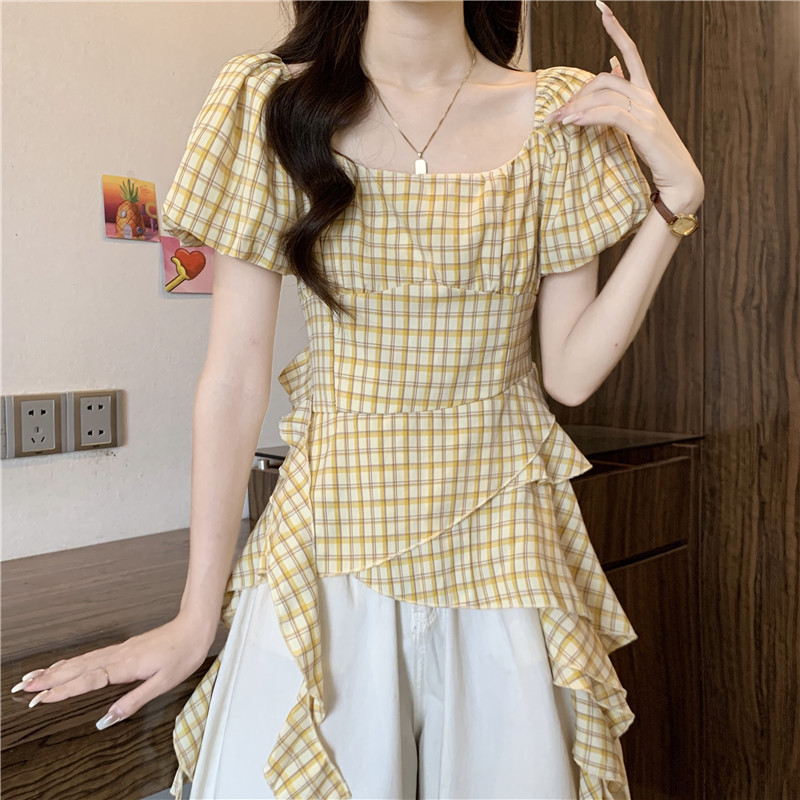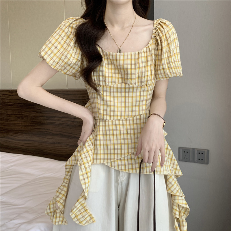 BY18854# 法式泡泡袖黄色格子短袖衬衫夏收腰遮肚超好看方领上衣 服裝批發女裝批發服飾貨源