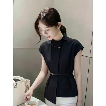 BY18924# 黑色衬衫女夏新款淡人高知穿搭独特漂亮法式高端气质掐腰上衣 服裝批發女裝批發服飾貨源