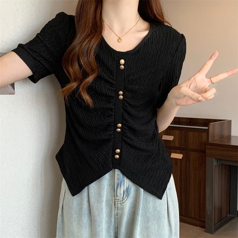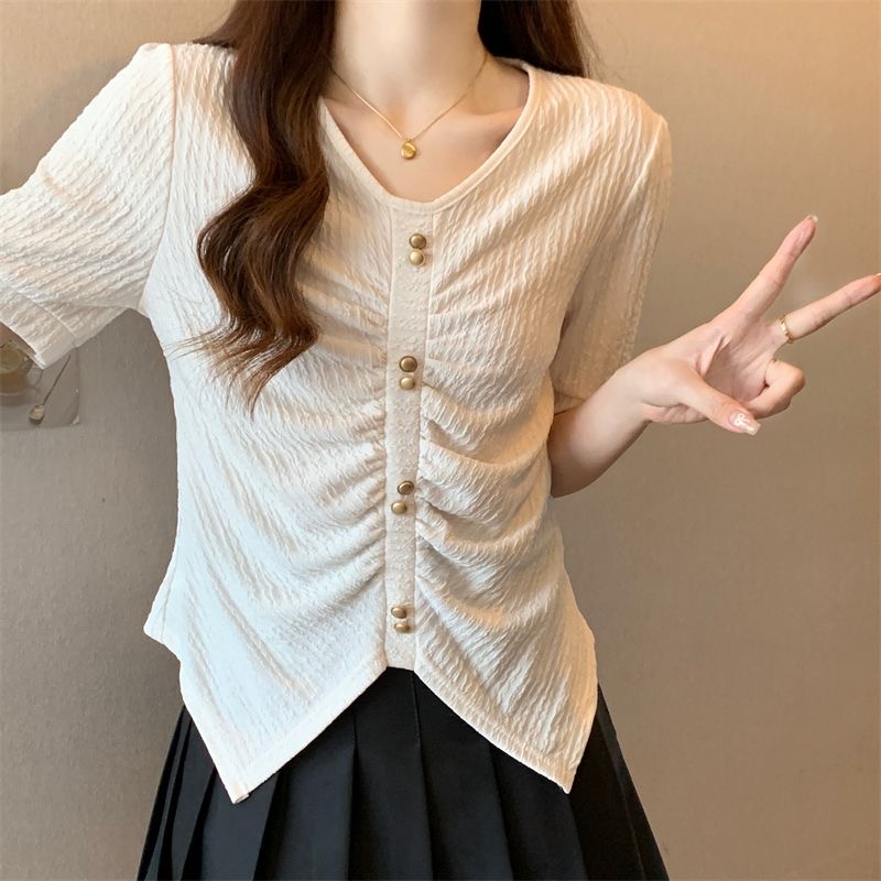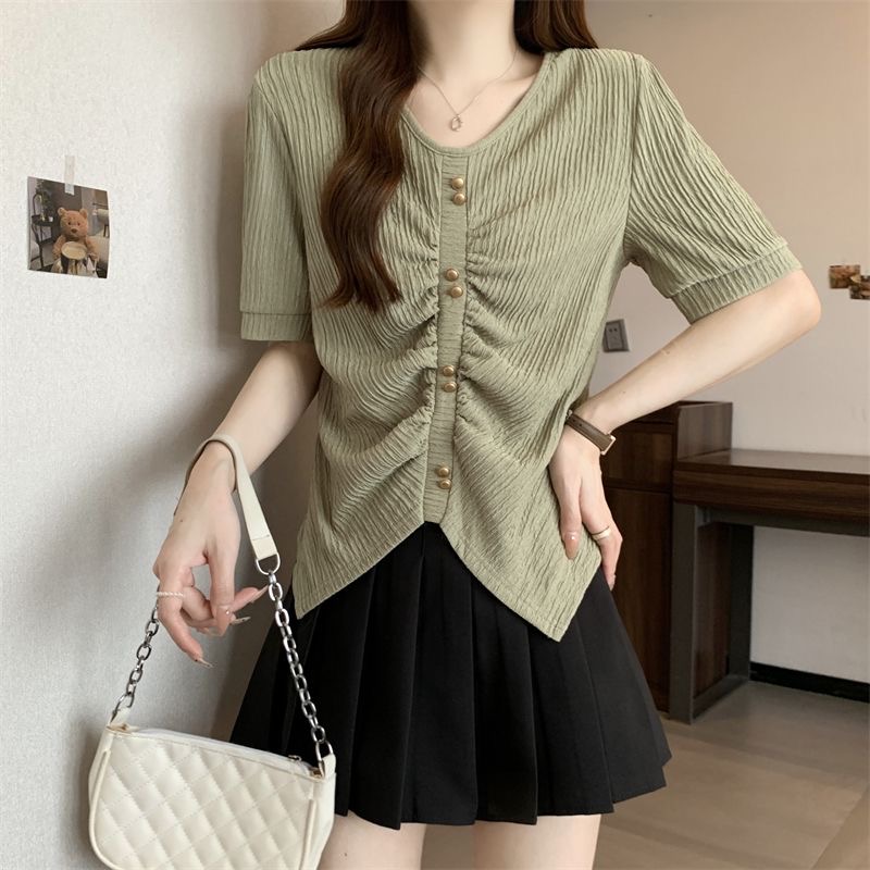 BY19191# 300斤大码女装短袖t恤胖mm洋气减龄设计感褶皱小衫不规则上衣女夏 服裝批發女裝批發服飾貨源