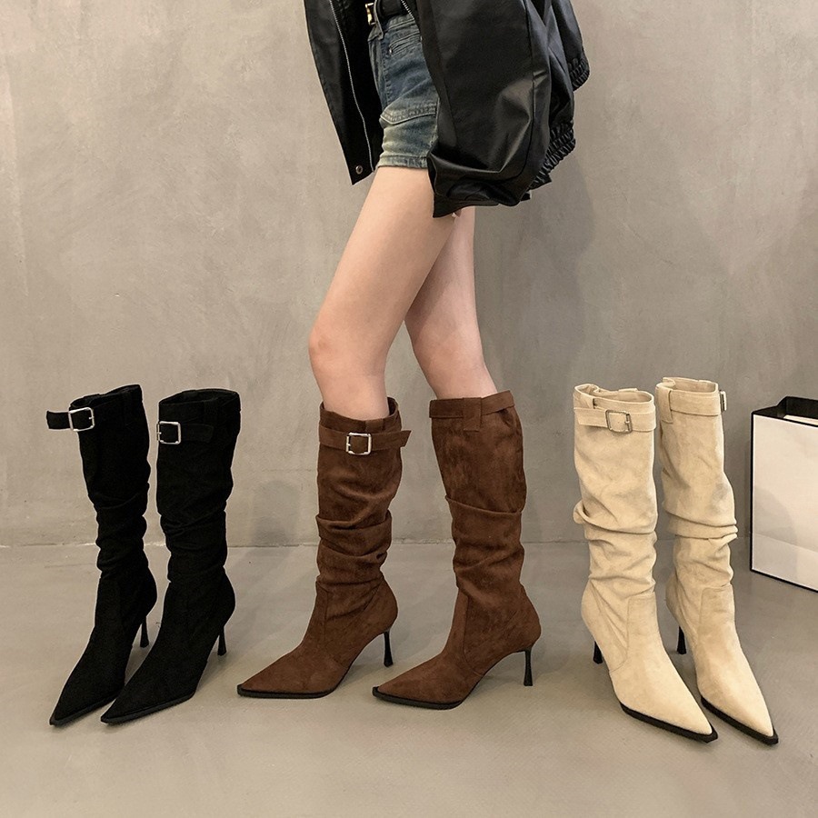 X-32047# 中筒尖头褶皱堆堆靴女细跟慵懒风辣妹夏季宽松绒面高跟靴子 鞋子批發女鞋批發鞋子靴子貨源