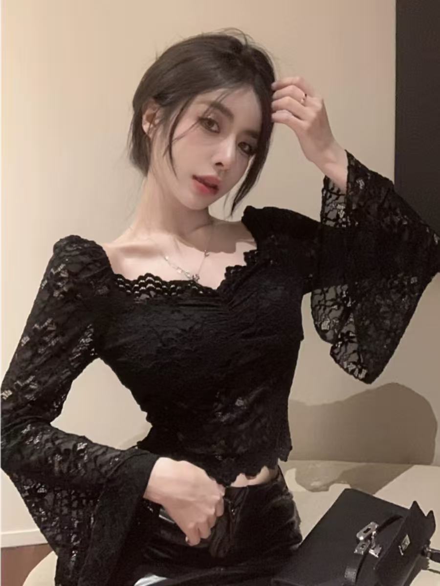 FA40206# 带胸垫喇叭袖蕾丝衫露锁骨法式修身显瘦百搭露脐短款黑色外穿上衣 服裝批發女裝批發服飾貨源