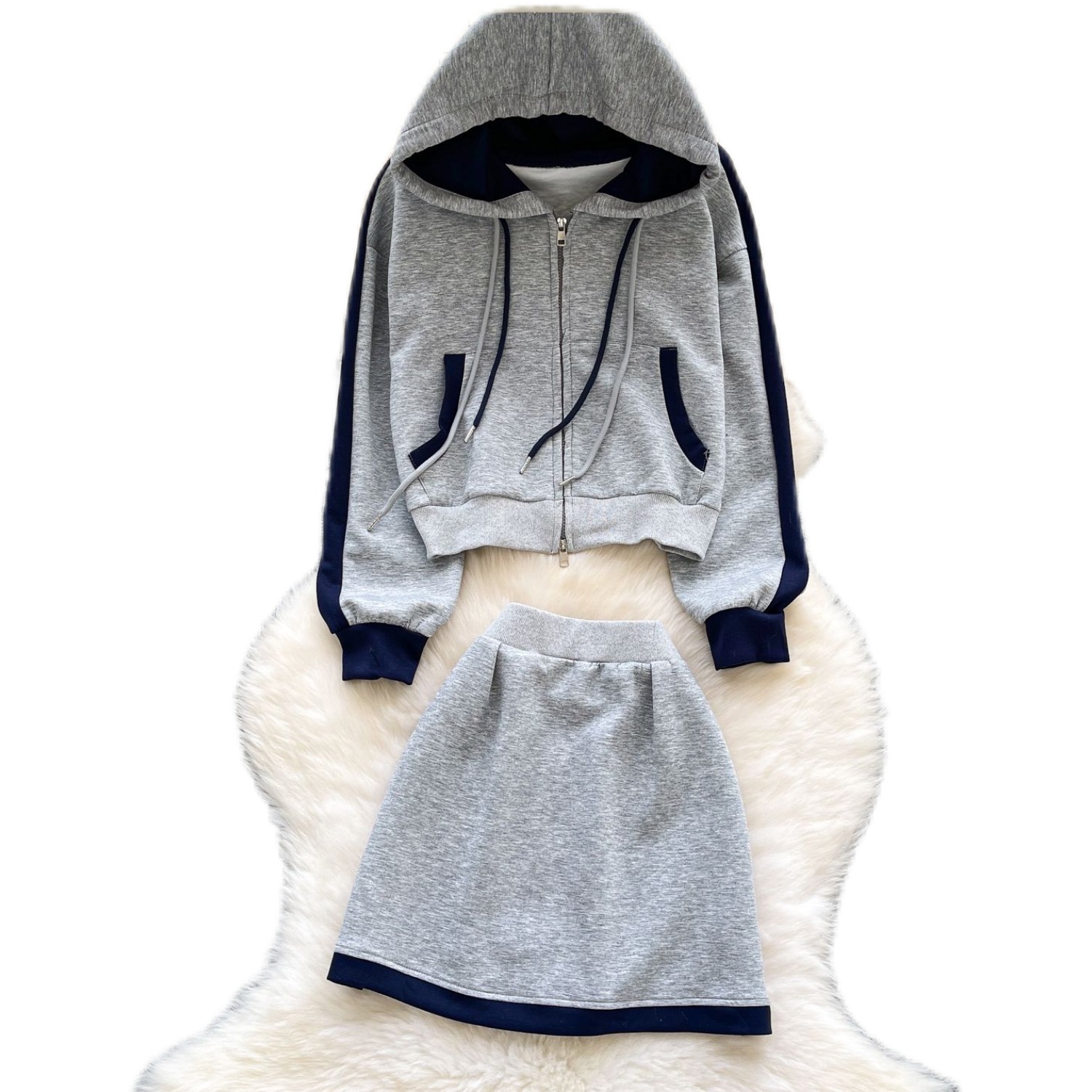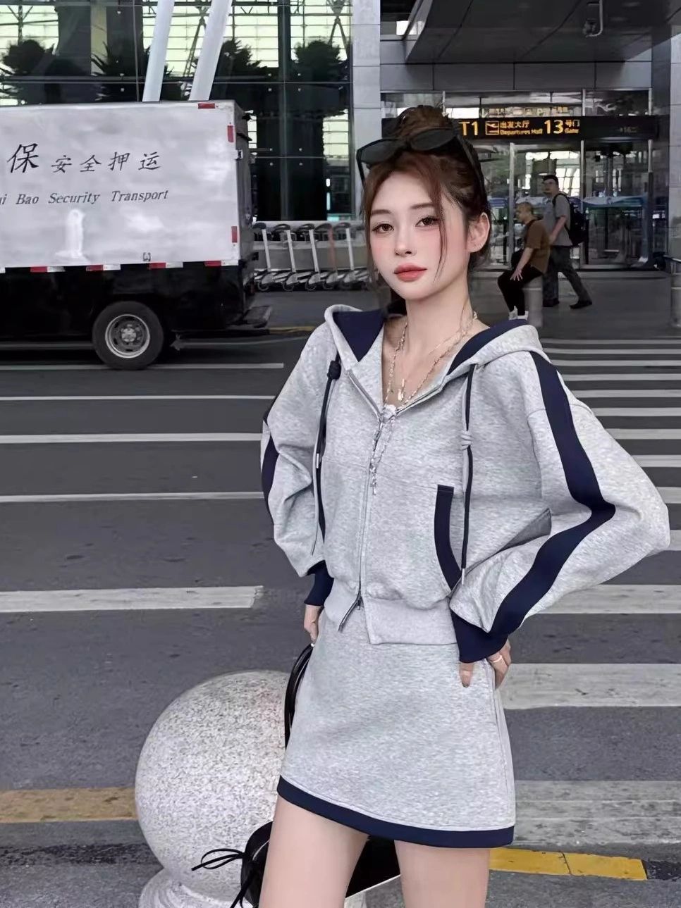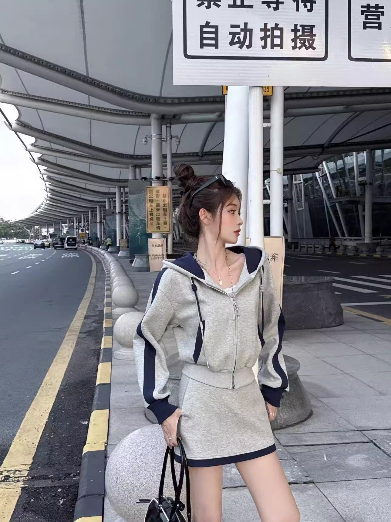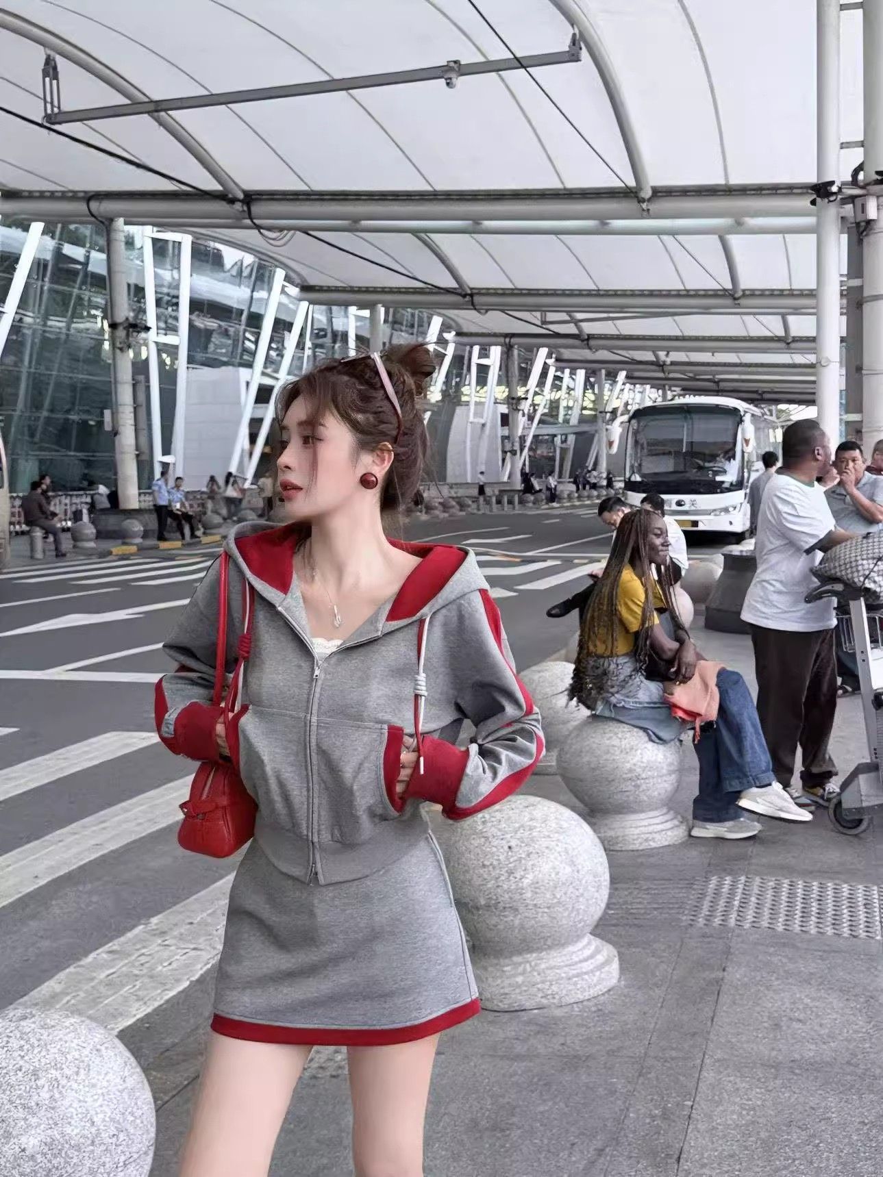 FA51248# 减龄撞色连帽卫衣+高腰短裙休闲两件套女 服裝批發女裝批發服飾貨源