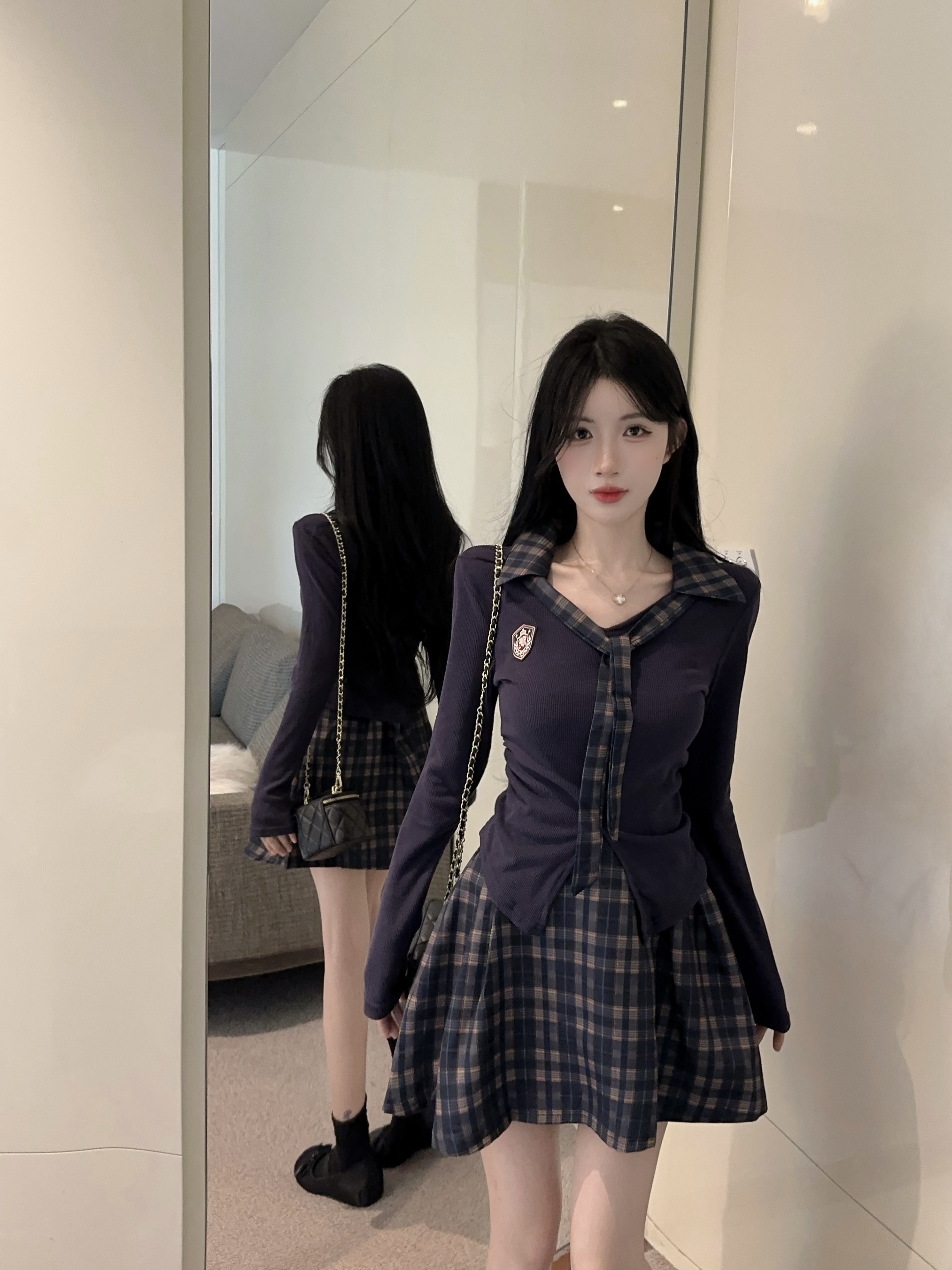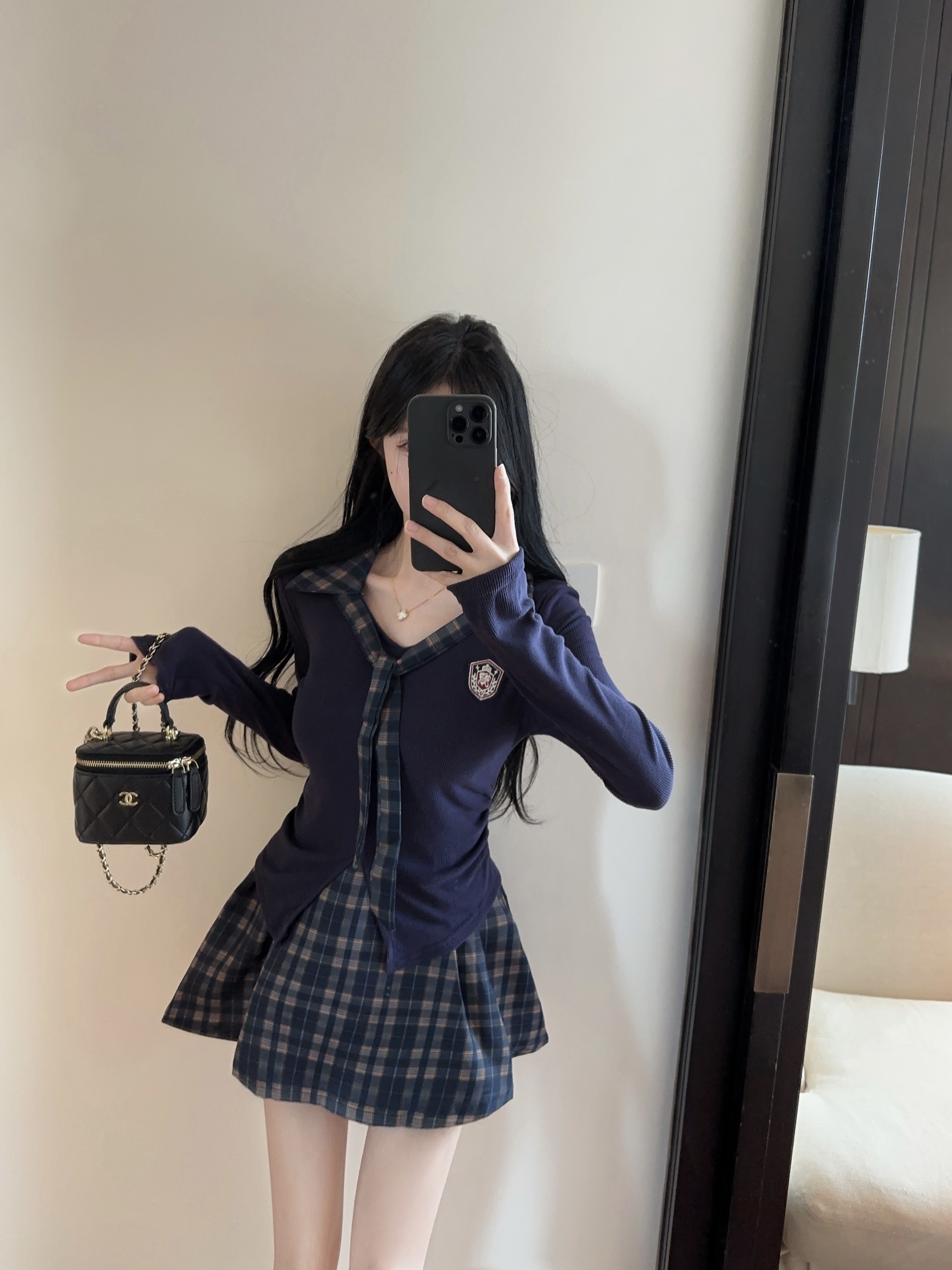 FA51312# 学院风套装小个子洋气减龄藏青色上衣格子半身裙两件套装裙超好看 服裝批發女裝批發服飾貨源
