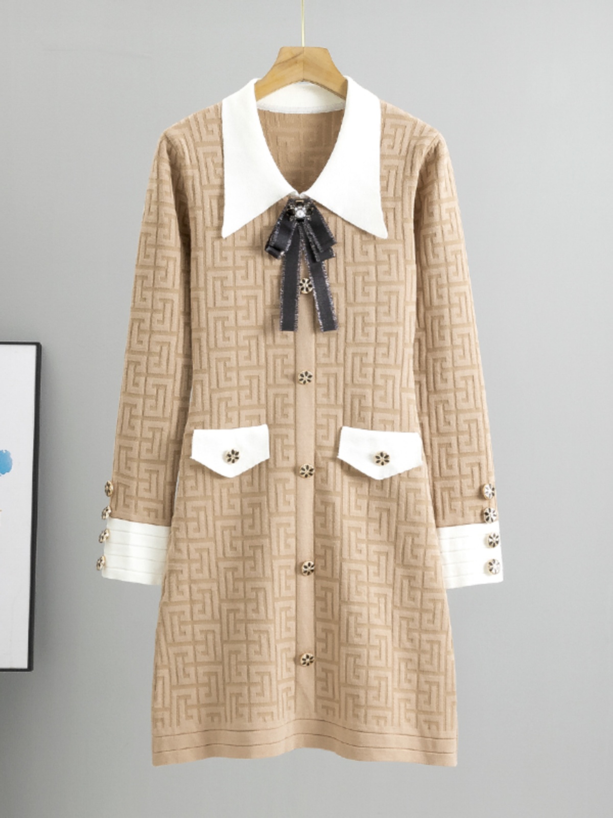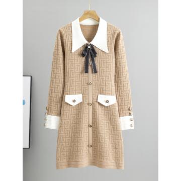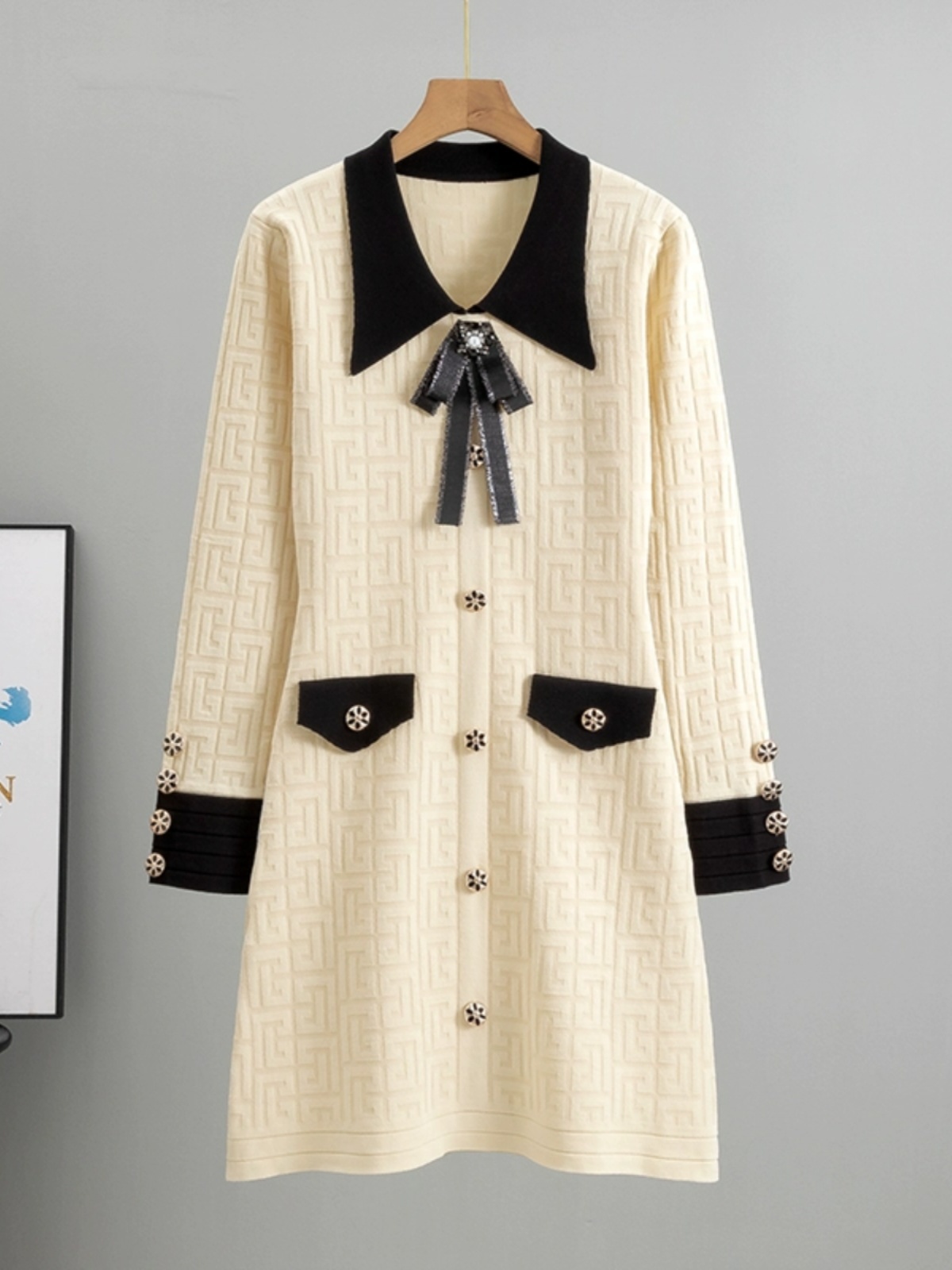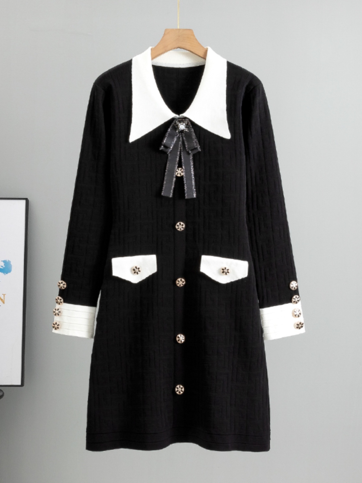 FA51415# 韩国气质女神范法式翻领蝴蝶结秋冬季长袖收腰针织连衣裙温柔 服裝批發女裝批發服飾貨源