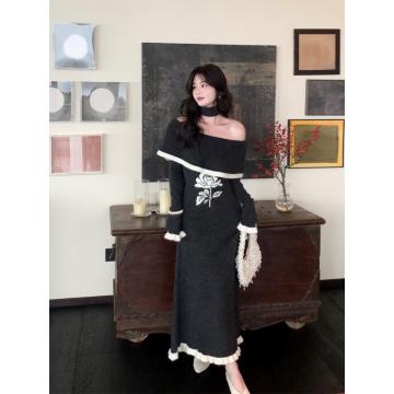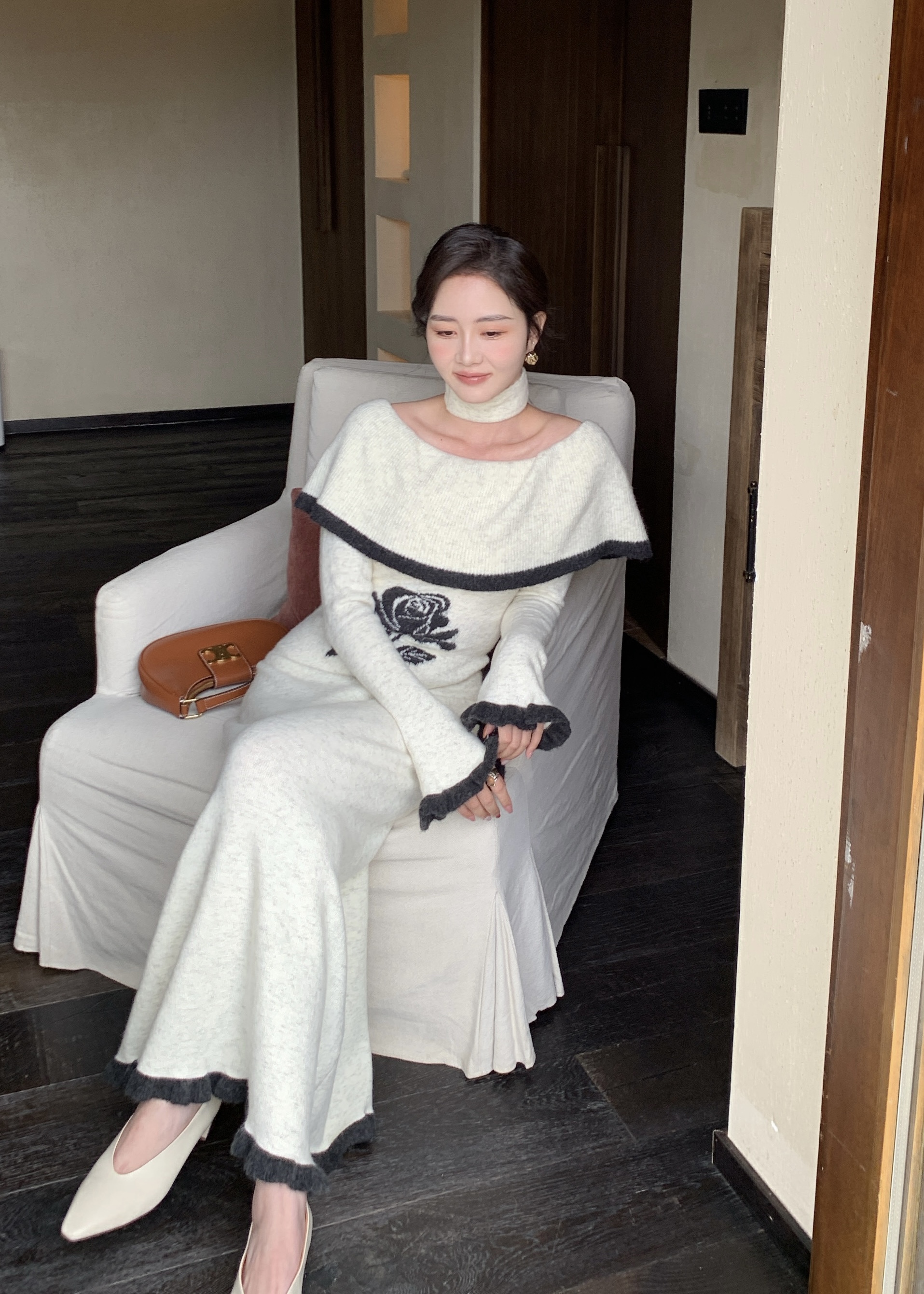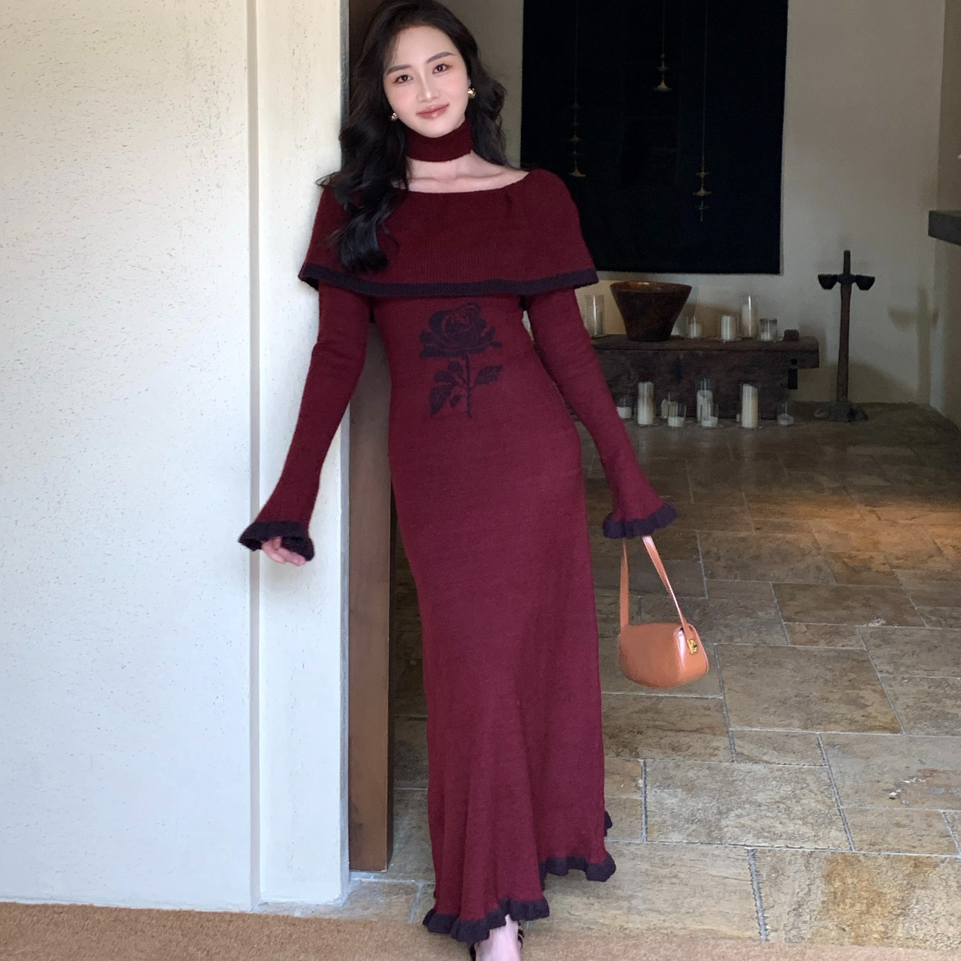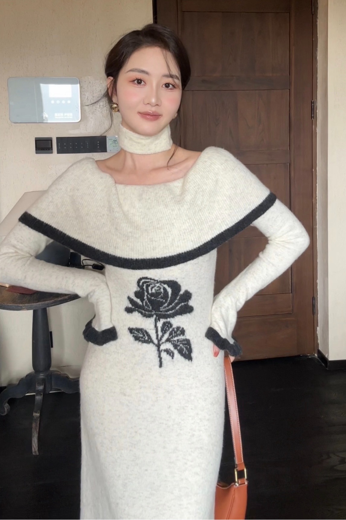 FA51416# 韩国大圆领围脖花朵羊毛针织连衣裙女冬喇叭袖收腰A型打底裙 服裝批發女裝批發服飾貨源