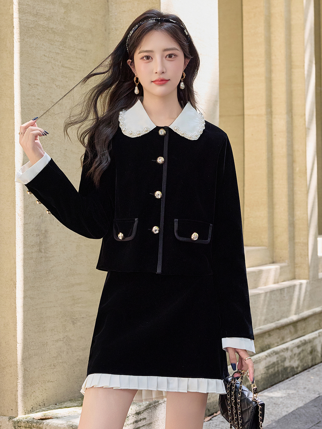 FA51486# 小香千金风黑色丝绒套装女秋新款气质珍珠娃娃领两件套 服裝批發女裝批發服飾貨源