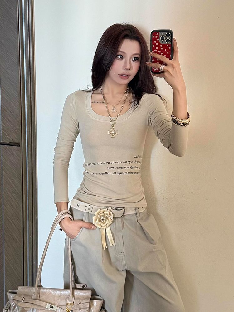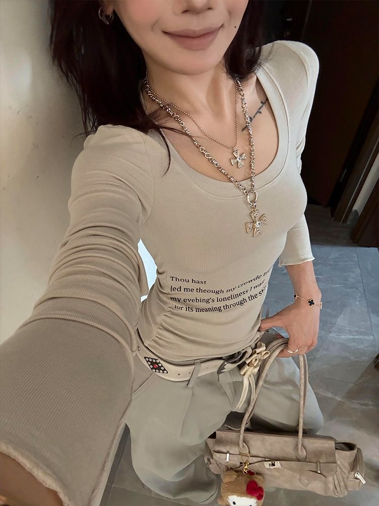FA51813# 精棉1*1美式辣妹U领字母印花长袖t恤女秋致打底上衣 服裝批發女裝批發服飾貨源