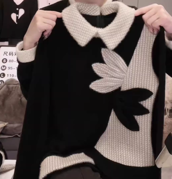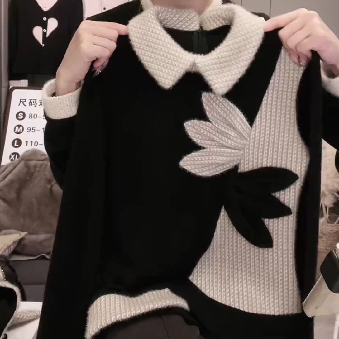 LN76409# 韩版撞色假两件翻领长袖上衣女重工花朵设计感显瘦百搭针织衫大码