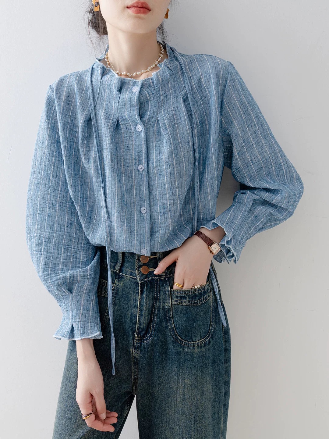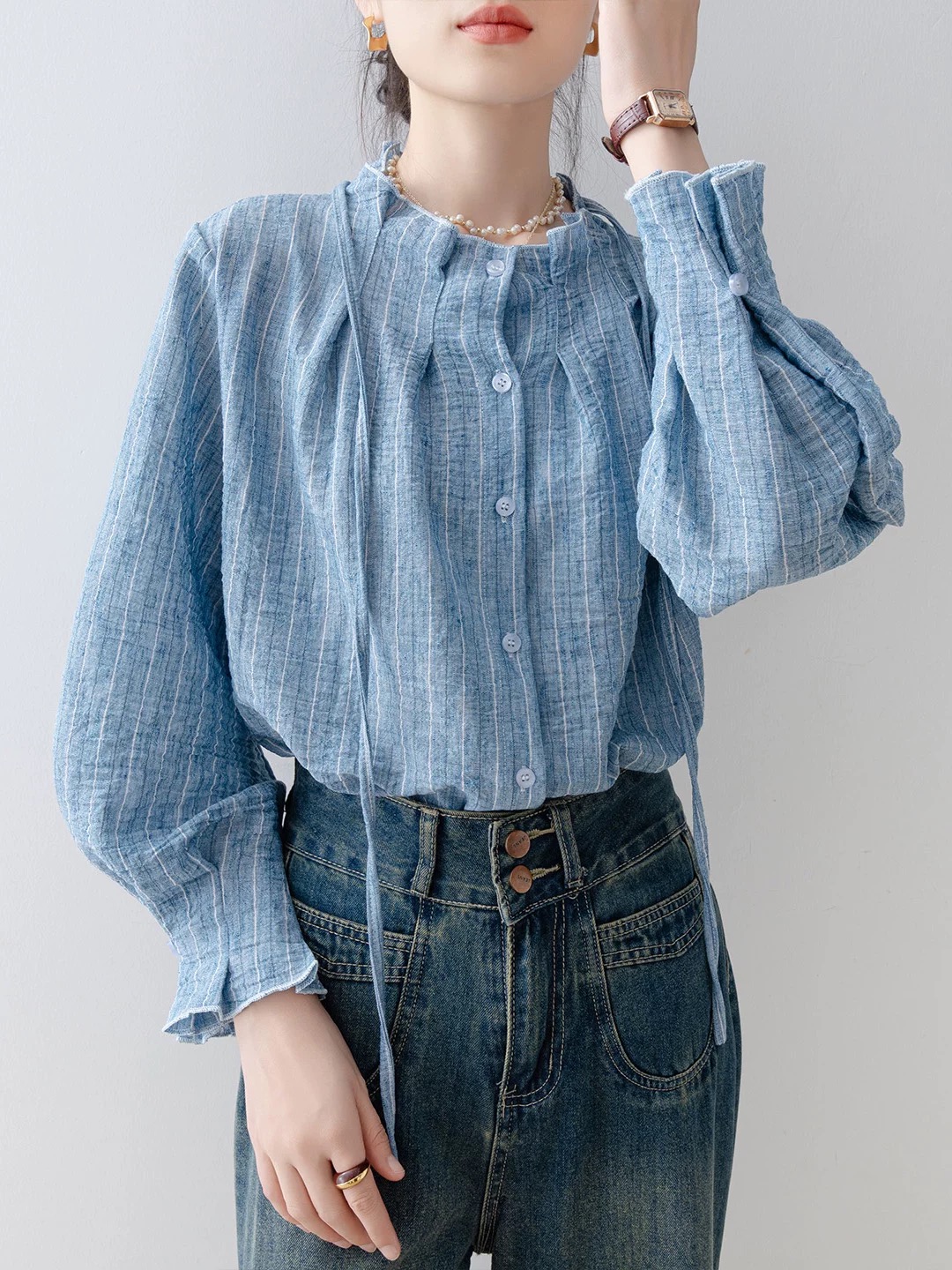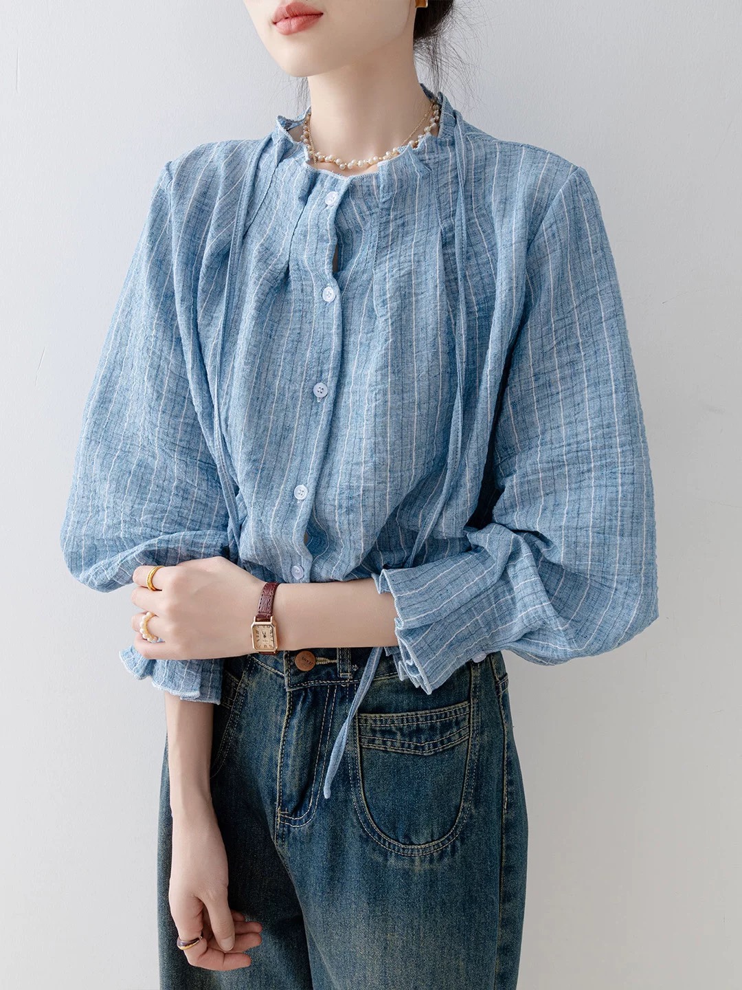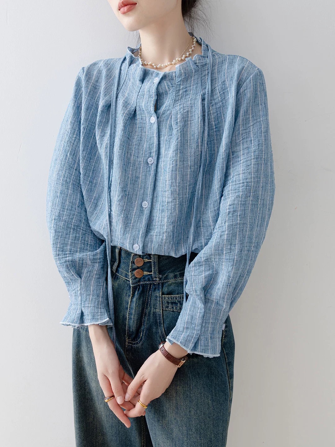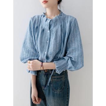 FA52625# 衬衣女款新款爆款秋冬季法式宽松圆领湖蓝色衬衫气质长袖上衣 服裝批發女裝批發服飾貨源