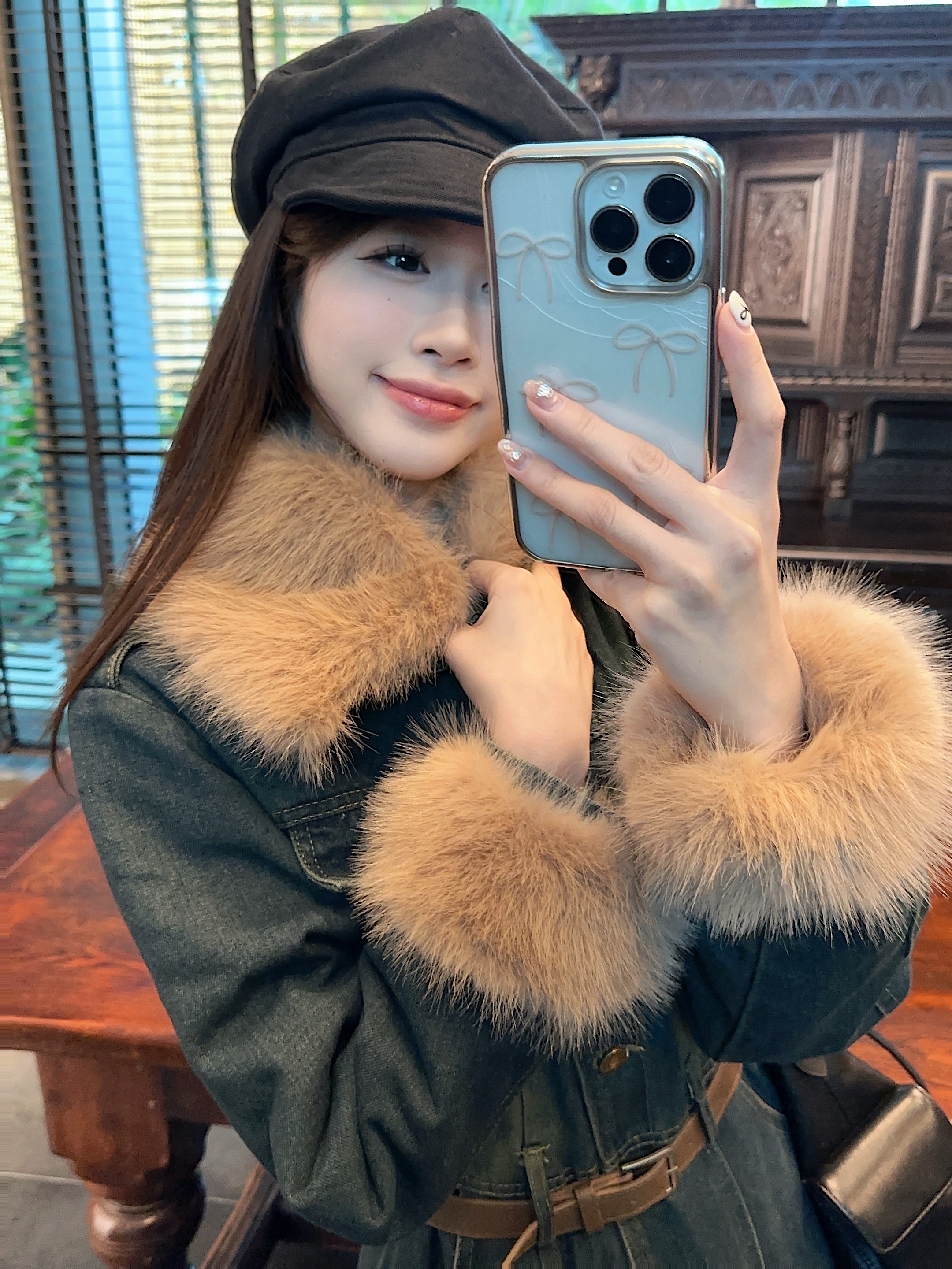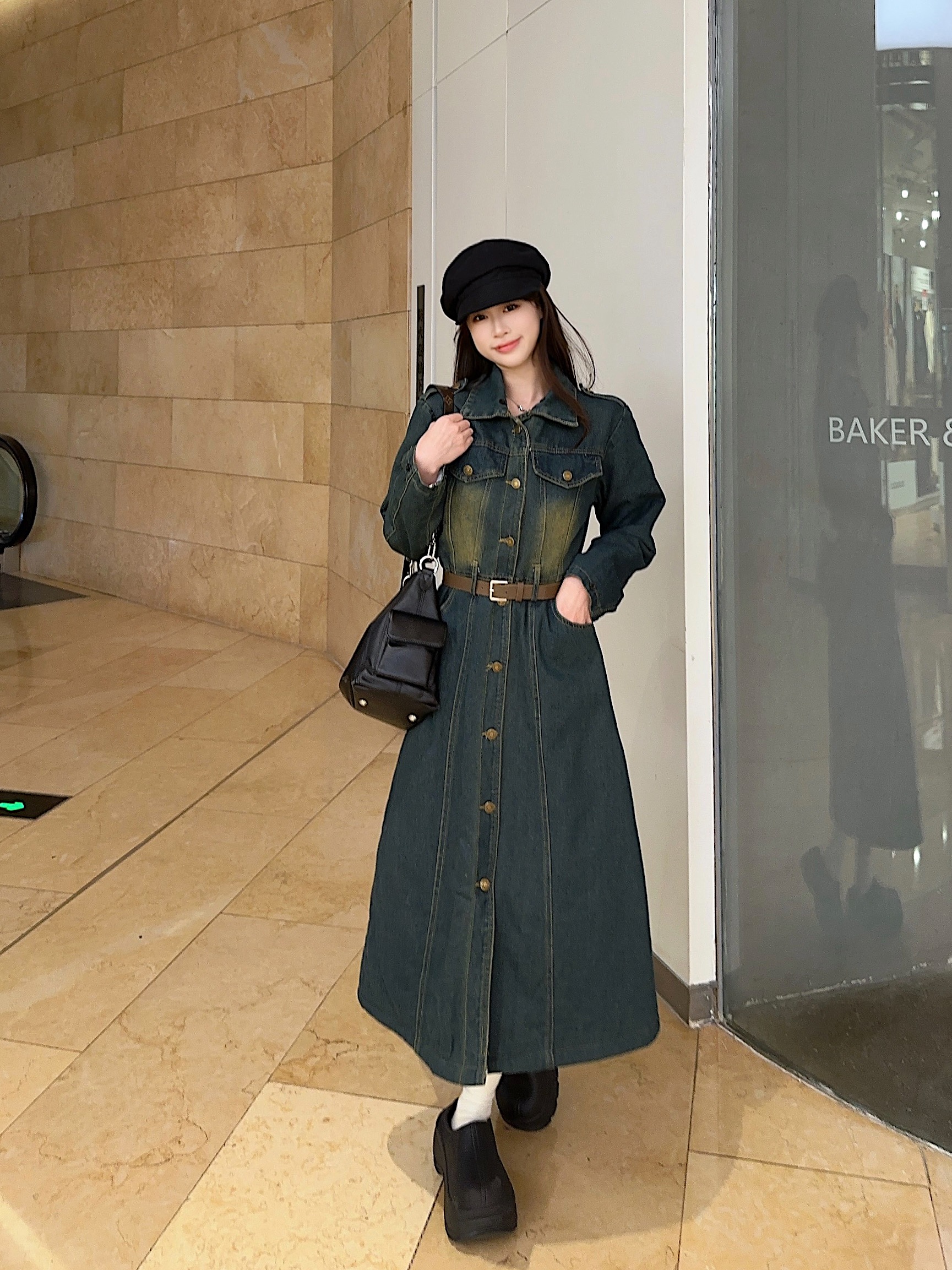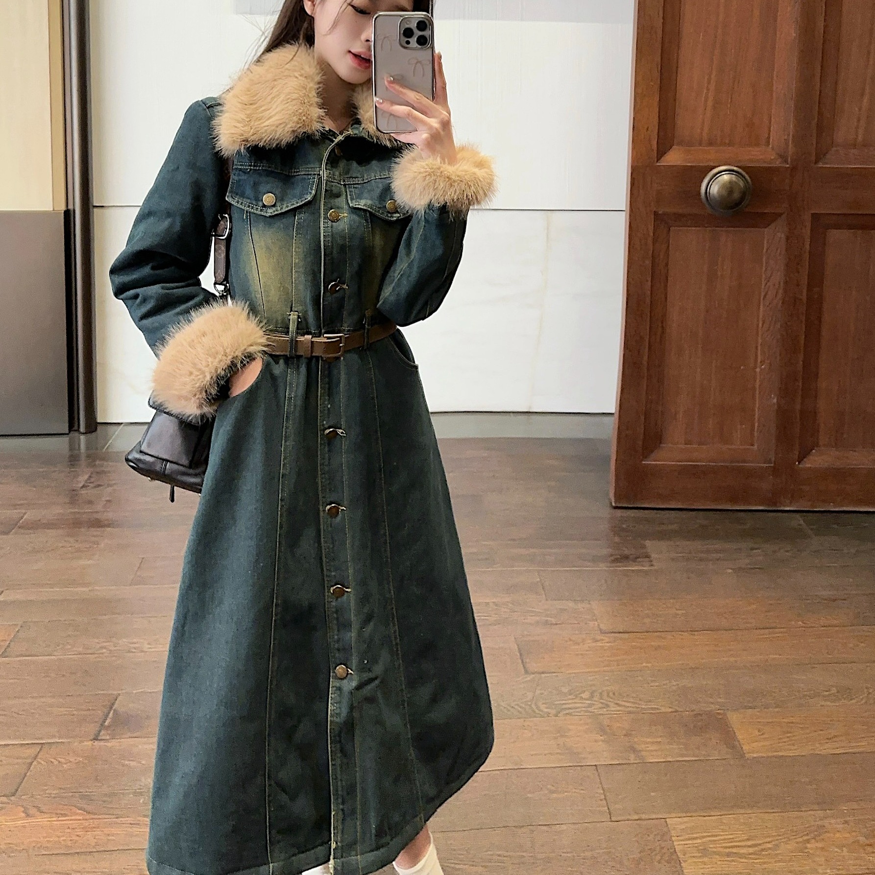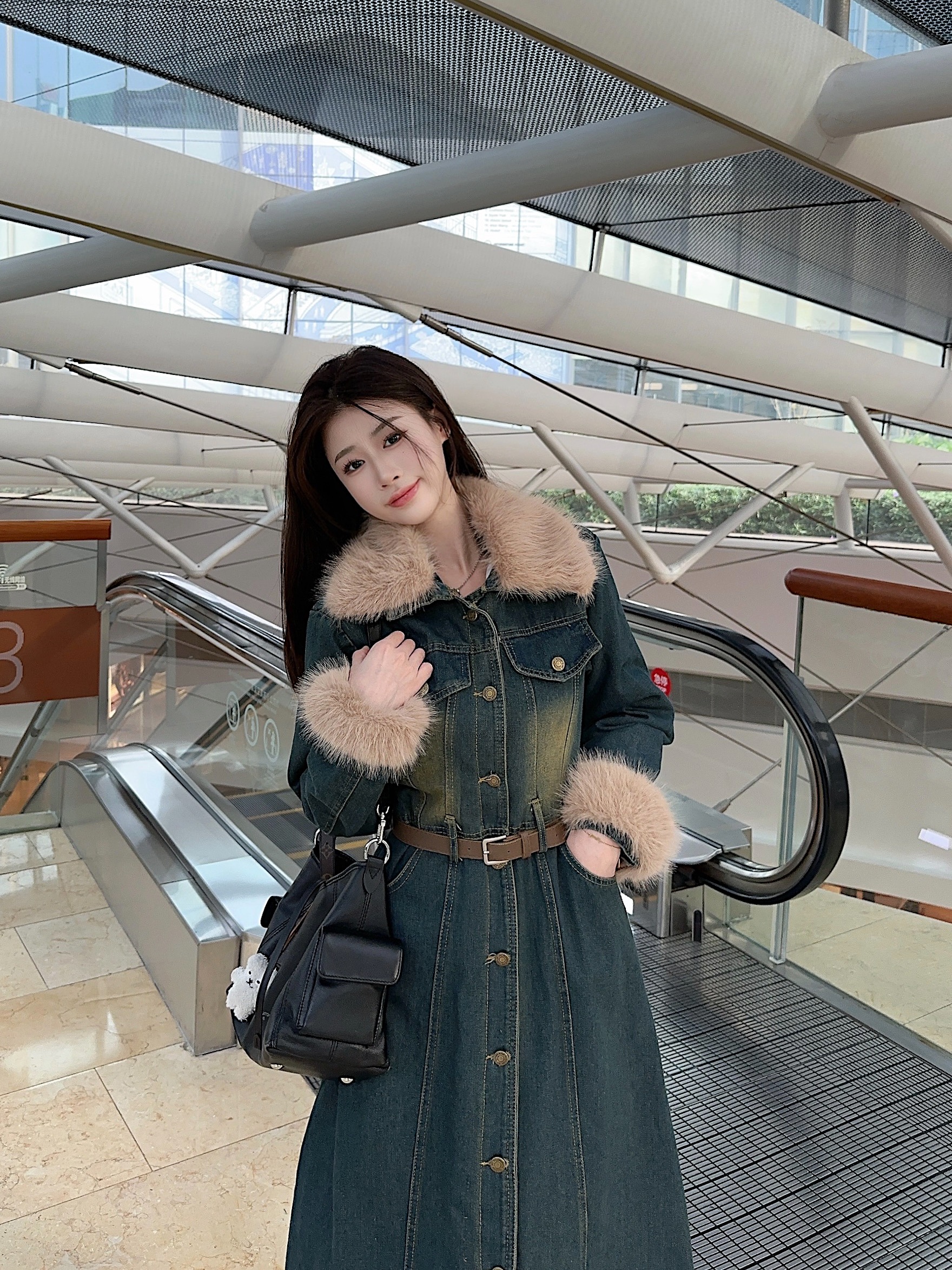 FA52719# 冬季美德拉复古毛领牛仔连衣裙气质收腰显瘦单排扣长裙 服裝批發女裝批發服飾貨源