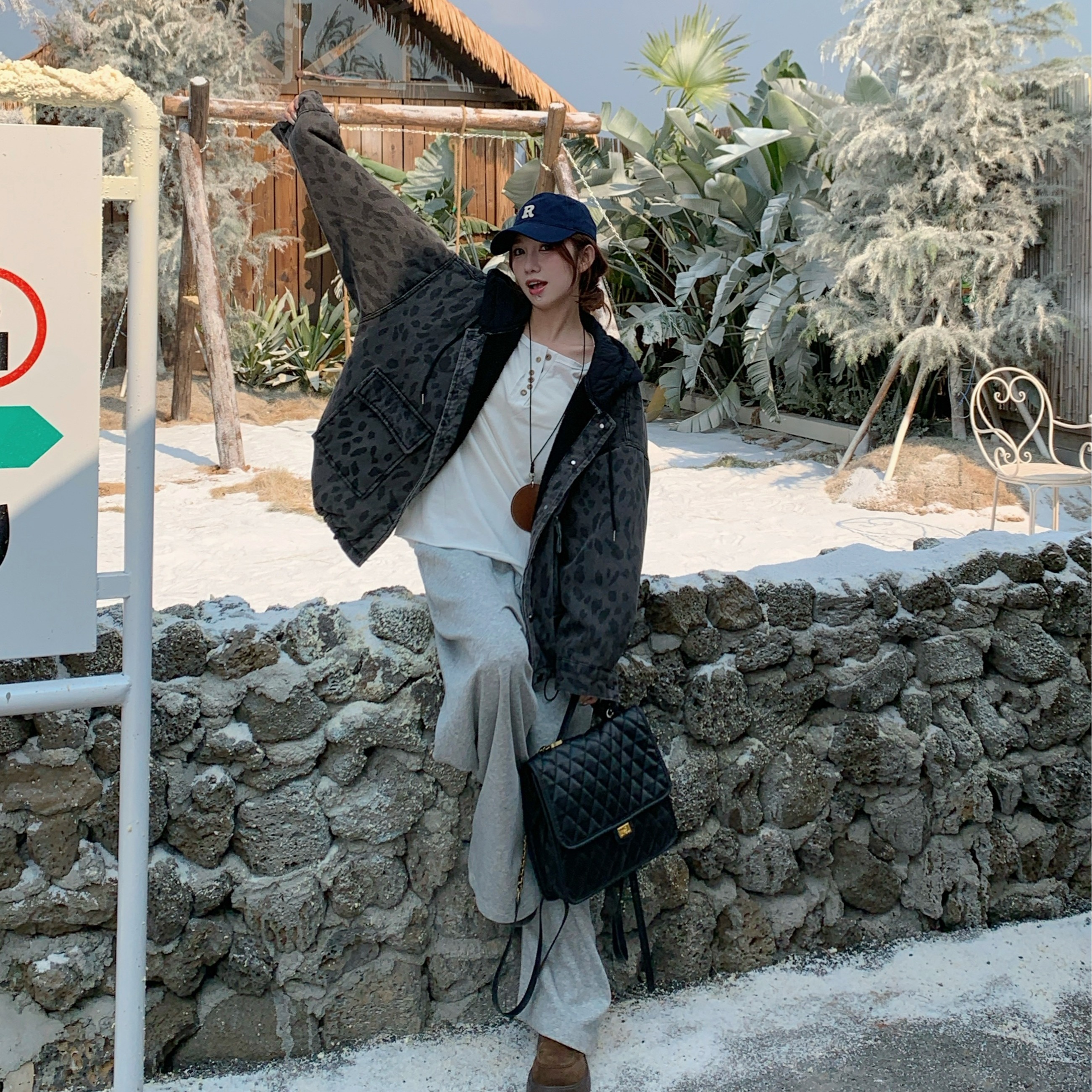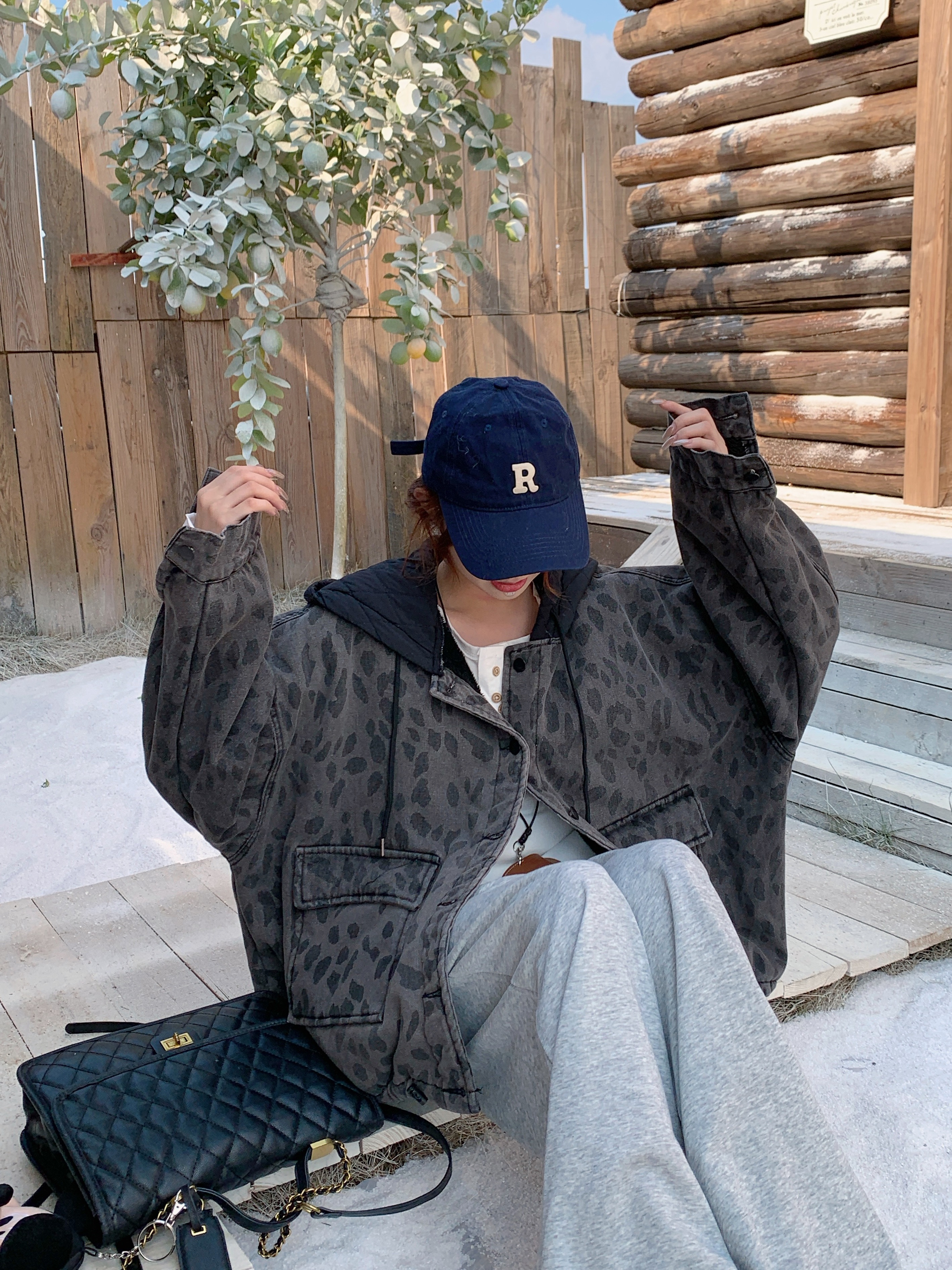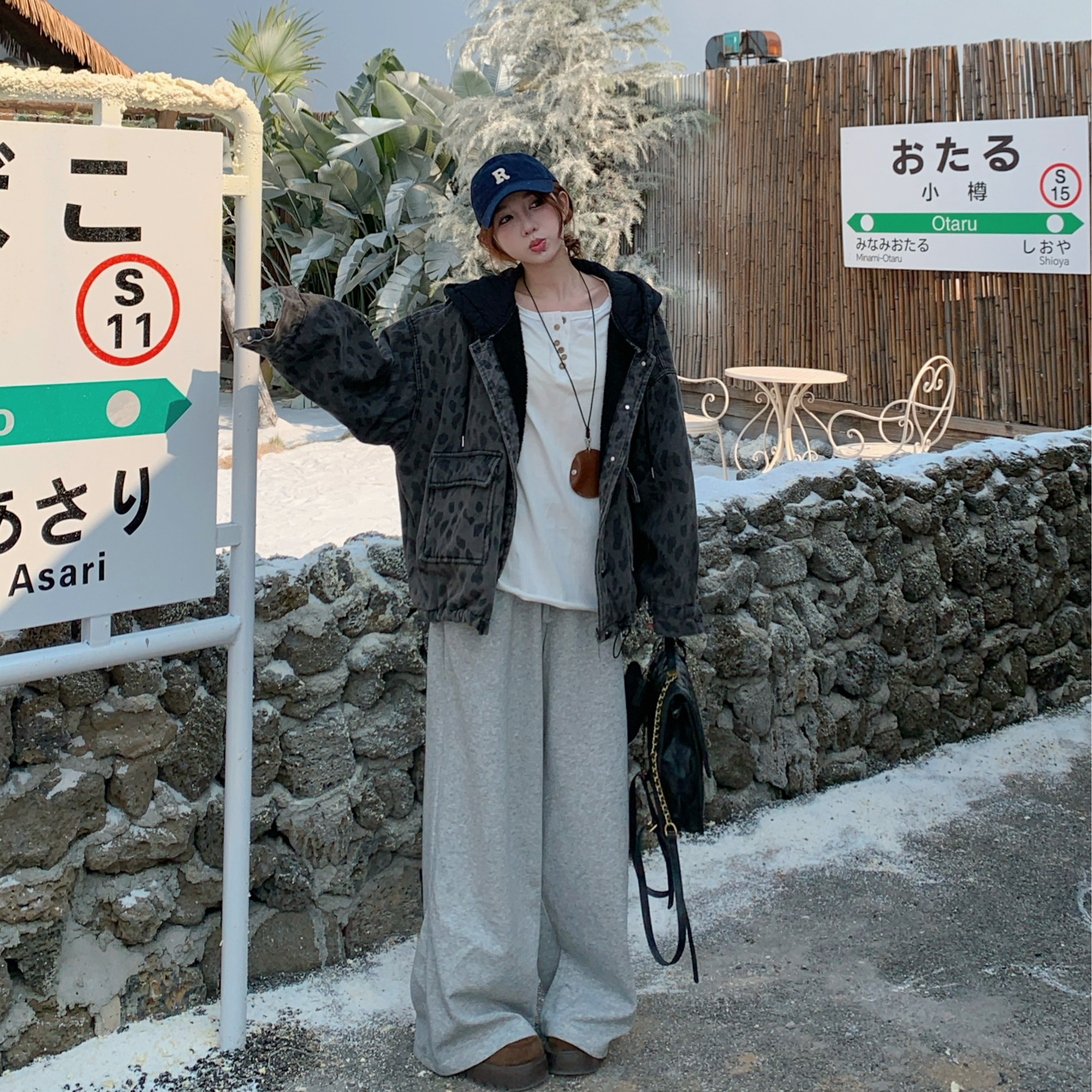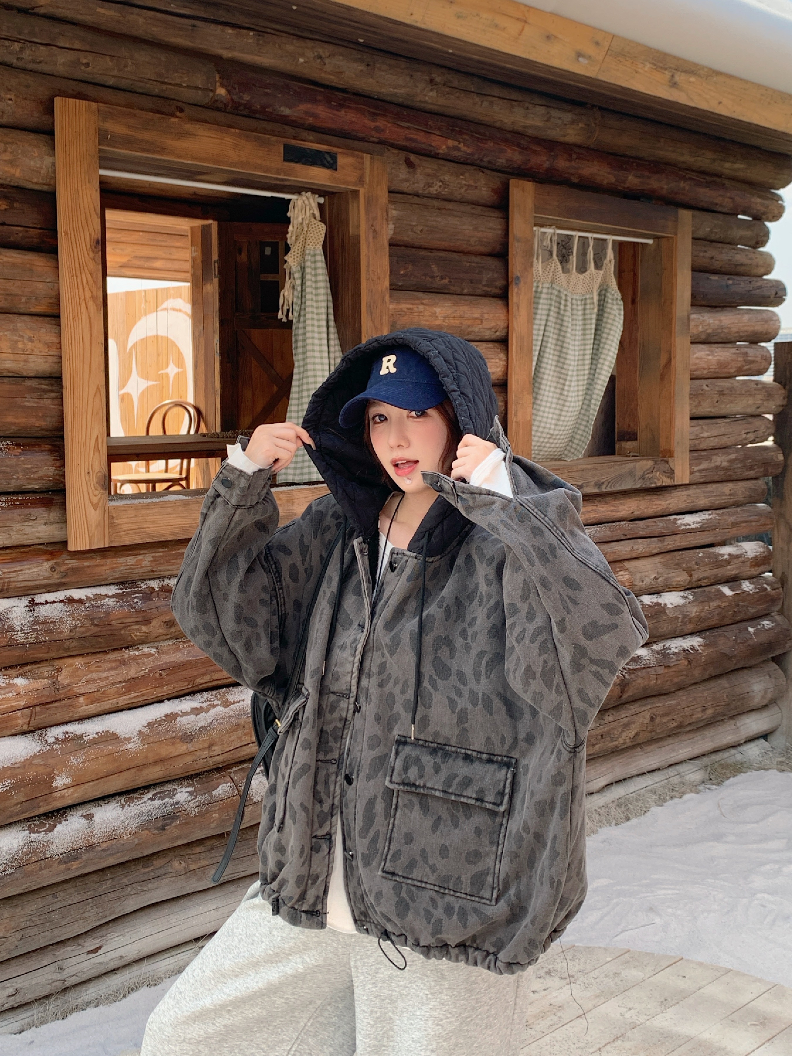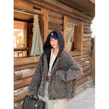 FA52723# 复古豹纹加绒加厚连帽牛仔外套冬休闲慵懒风羊羔毛夹克 服裝批發女裝批發服飾貨源