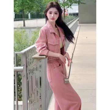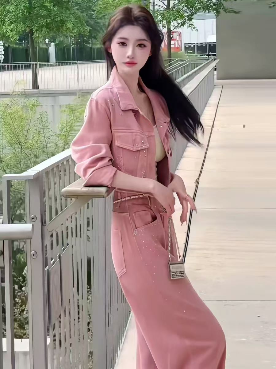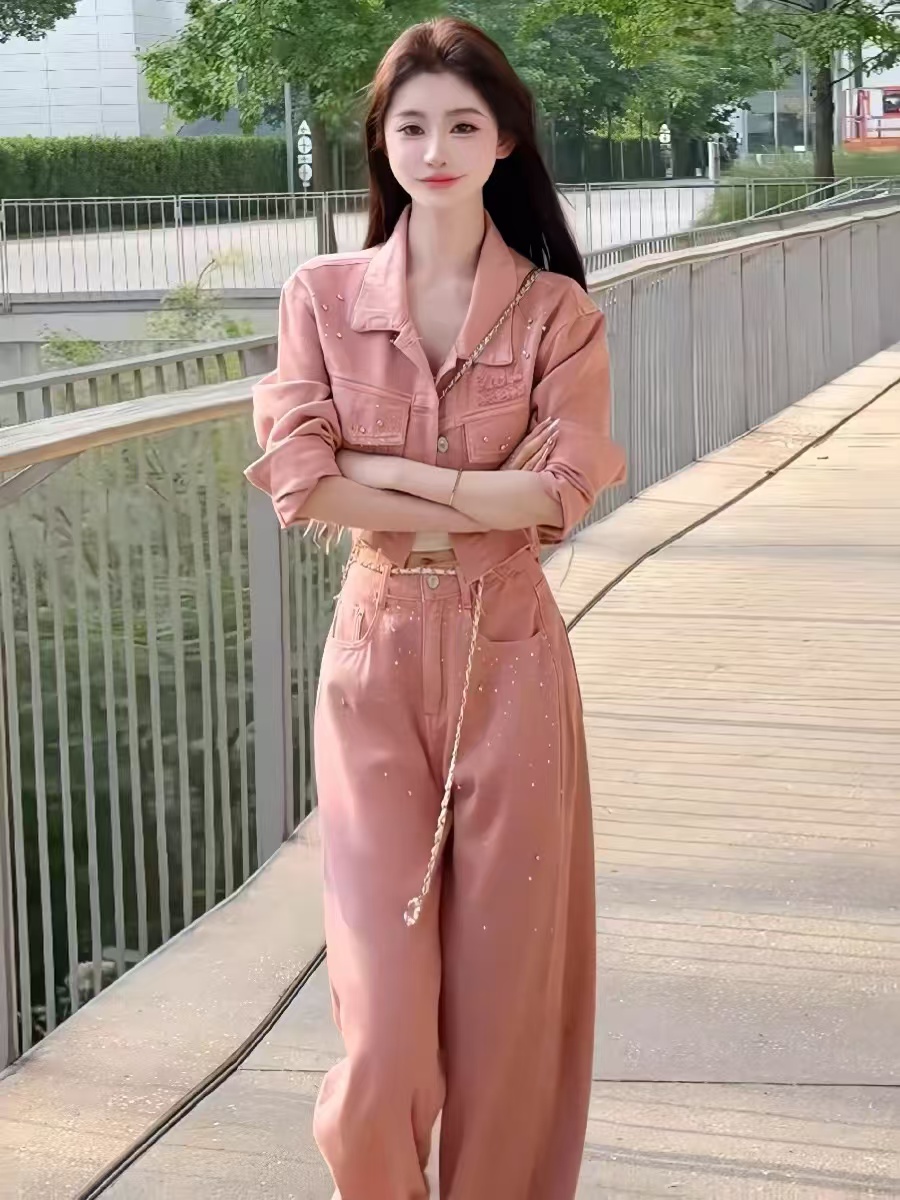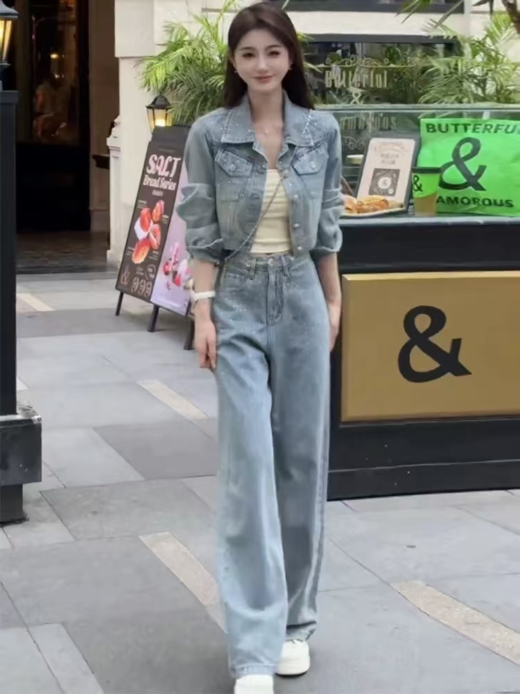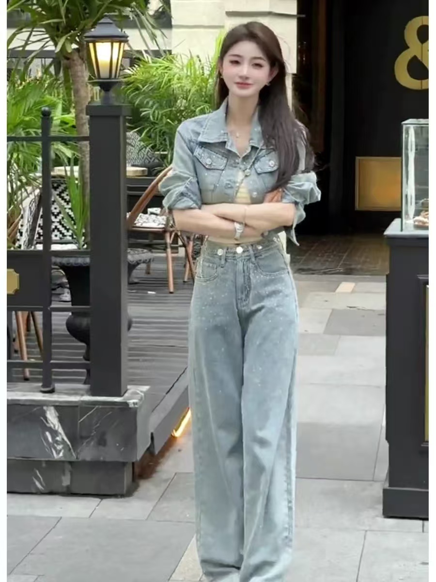 FA52732# 复古闪闪烫钻单排扣短款牛仔外套女秋季小个子高腰阔腿裤套装 服裝批發女裝批發服飾貨源