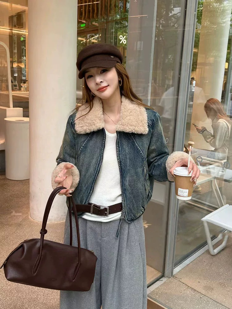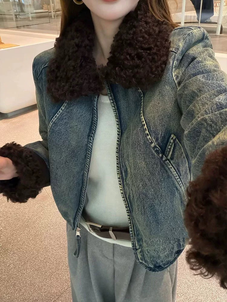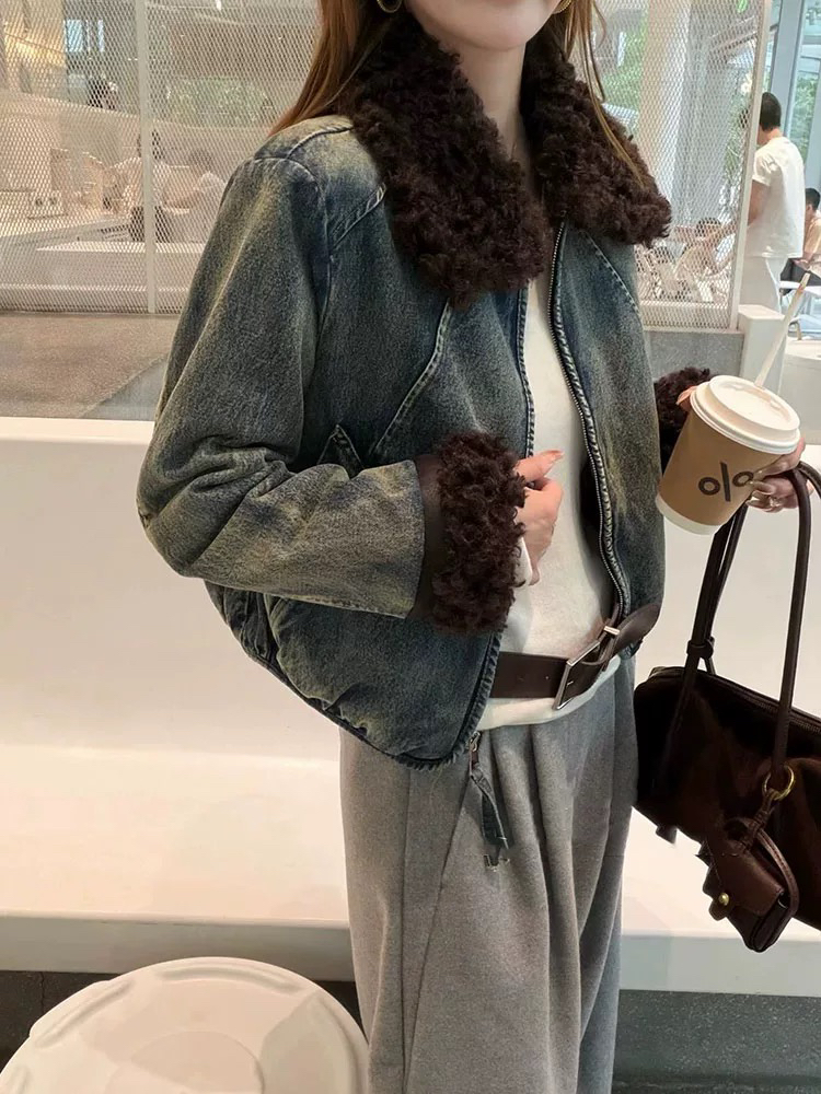 FA52739# 羊羔毛翻领牛仔外套女欧洲站冬季加厚小个子韩版法式复古短款上衣 服裝批發女裝批發服飾貨源