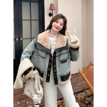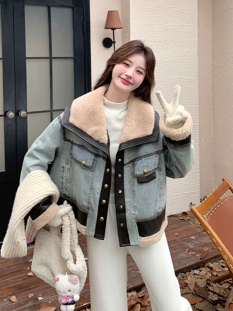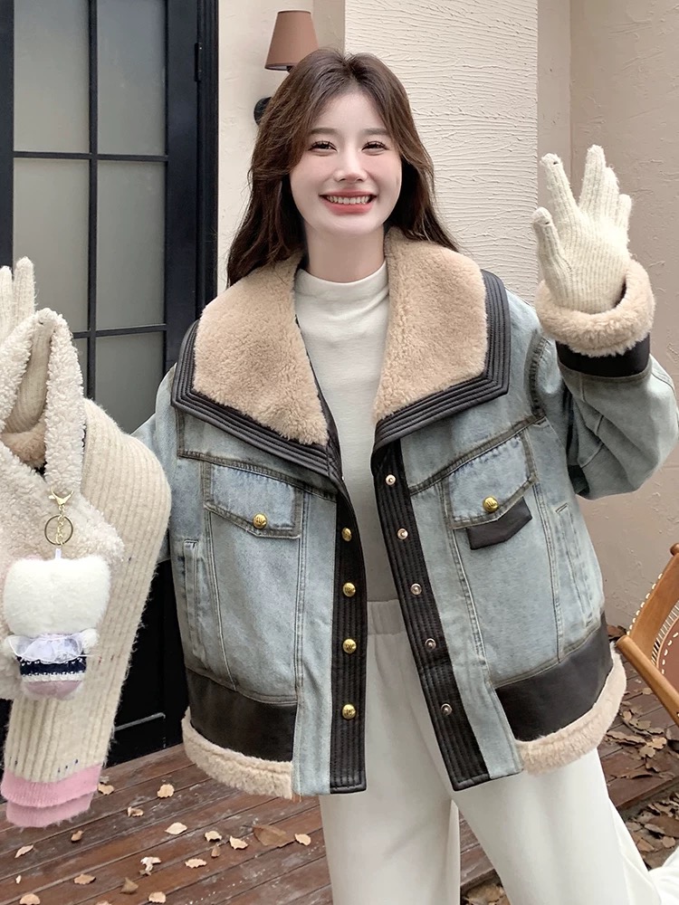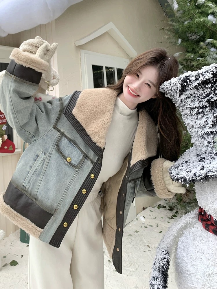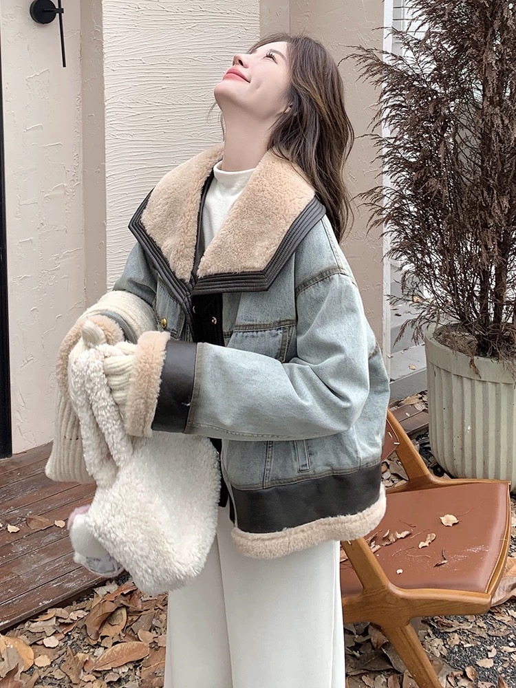 FA52740# 牛仔羽绒服女冬季新款设计感拼接超好看羊羔毛领羽绒内胆外套 服裝批發女裝批發服飾貨源