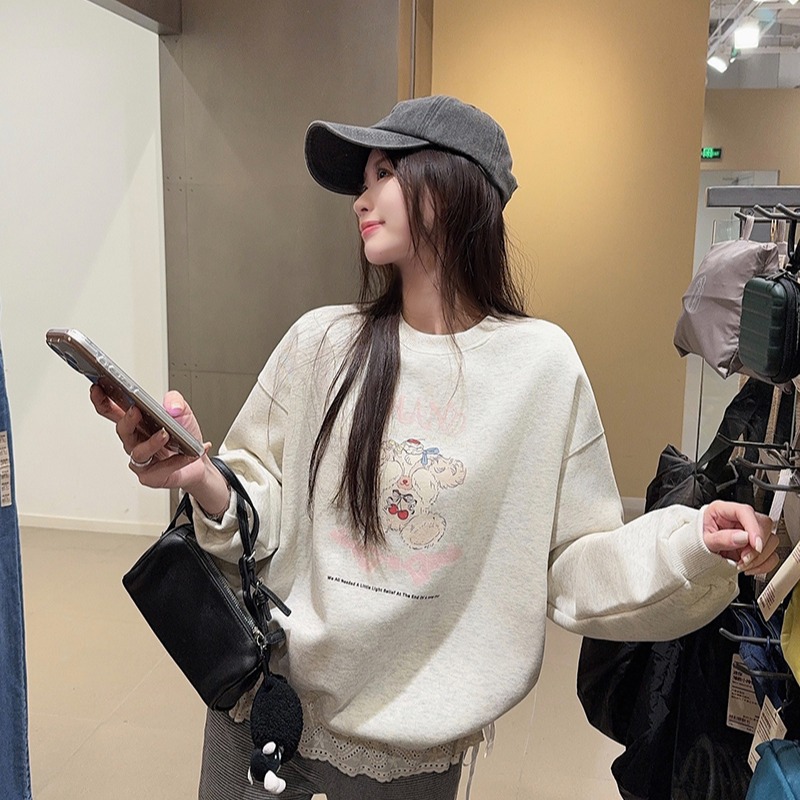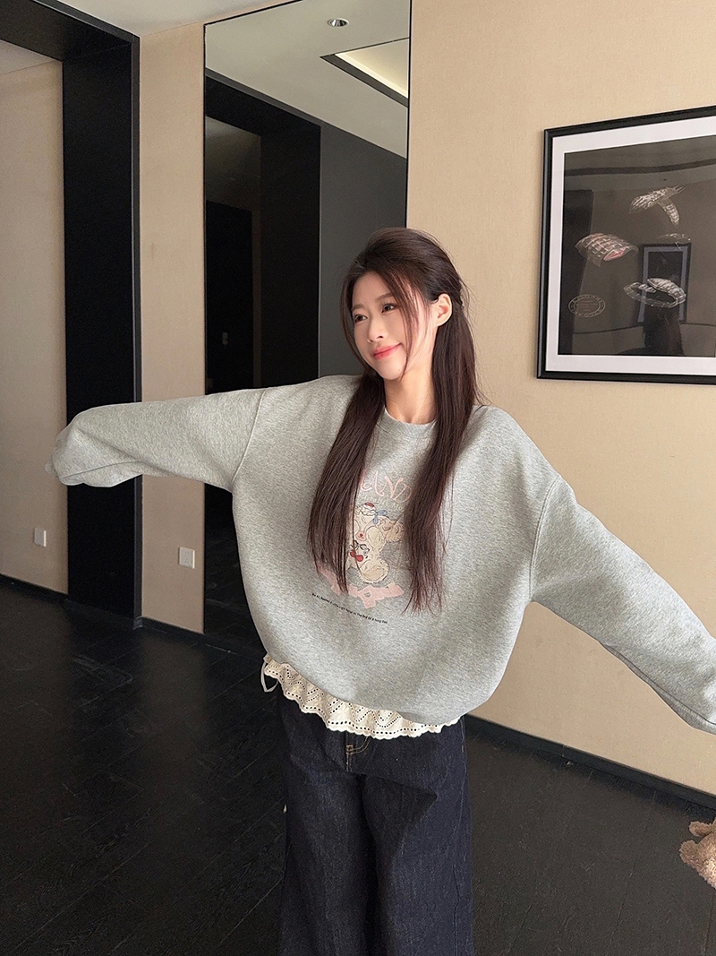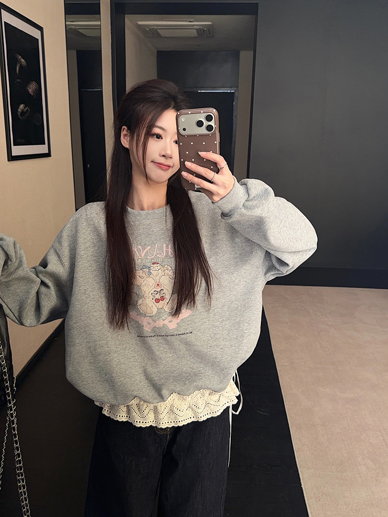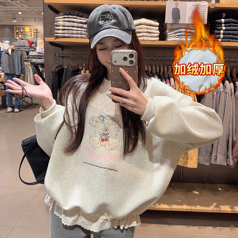 FA52924# 纯棉华棉复合真超加绒卫衣秋冬新款蕾丝花边圆领保暖上衣 服裝批發女裝批發服飾貨源