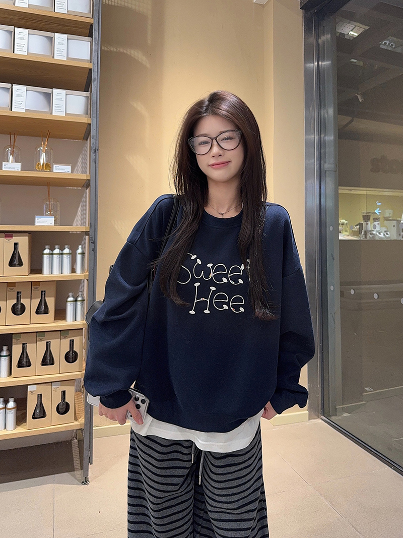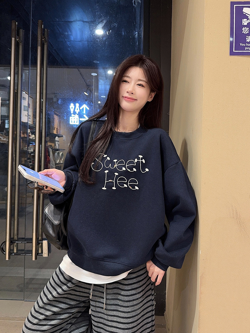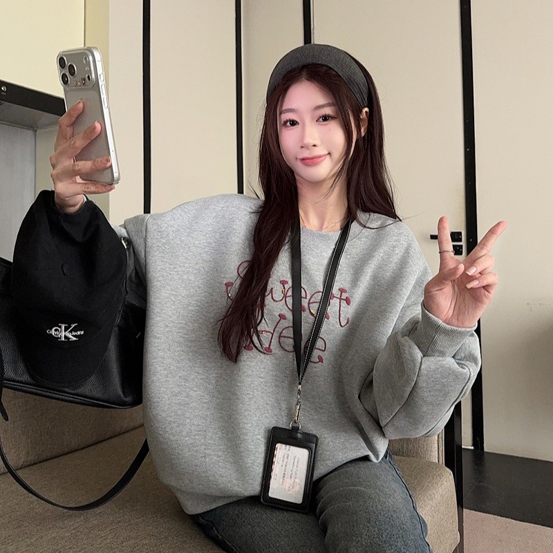 FA52926# 纯棉华棉复合真超加绒卫衣秋冬新款潮刺绣花宽松圆领保暖上衣 服裝批發女裝批發服飾貨源