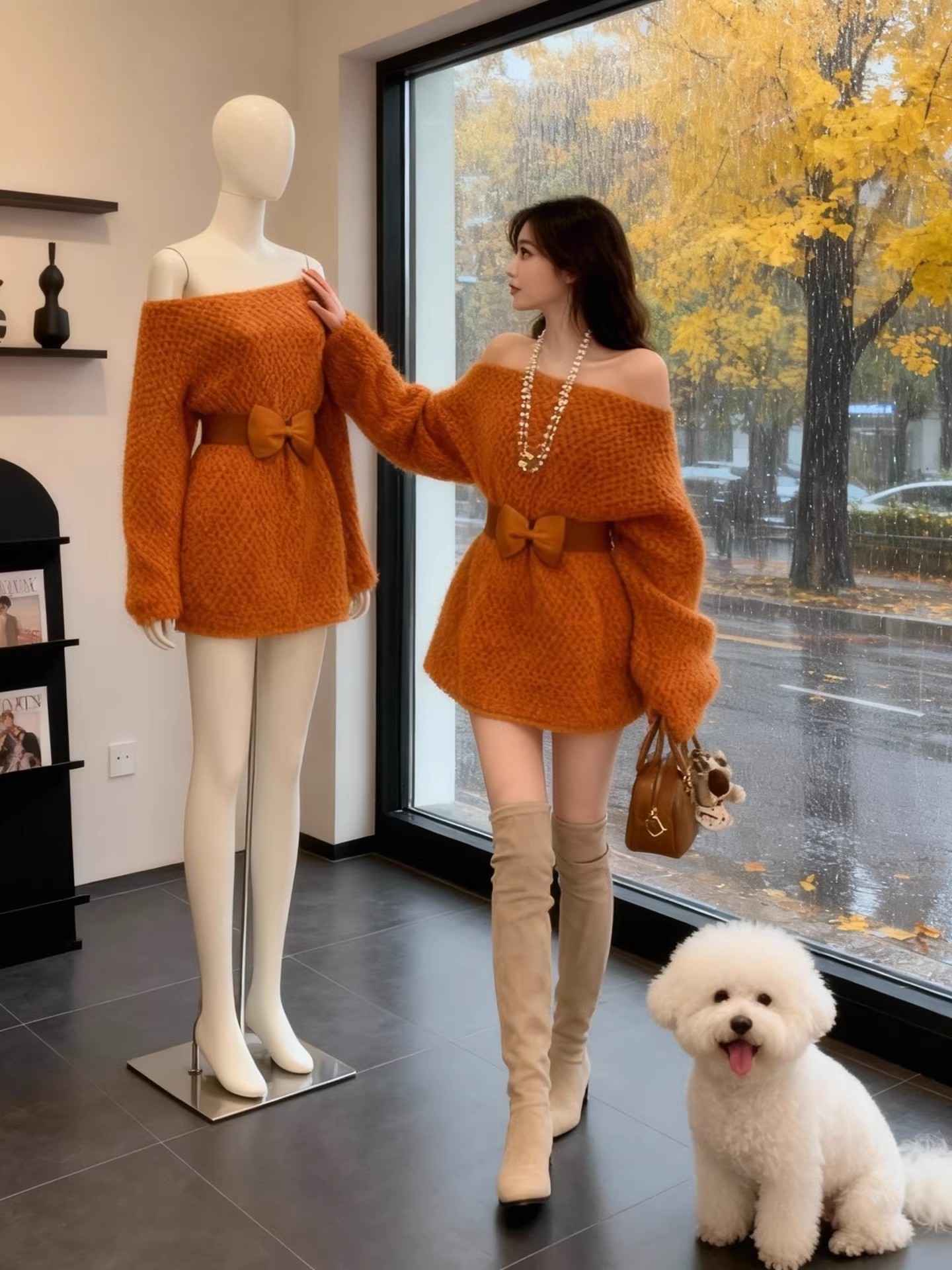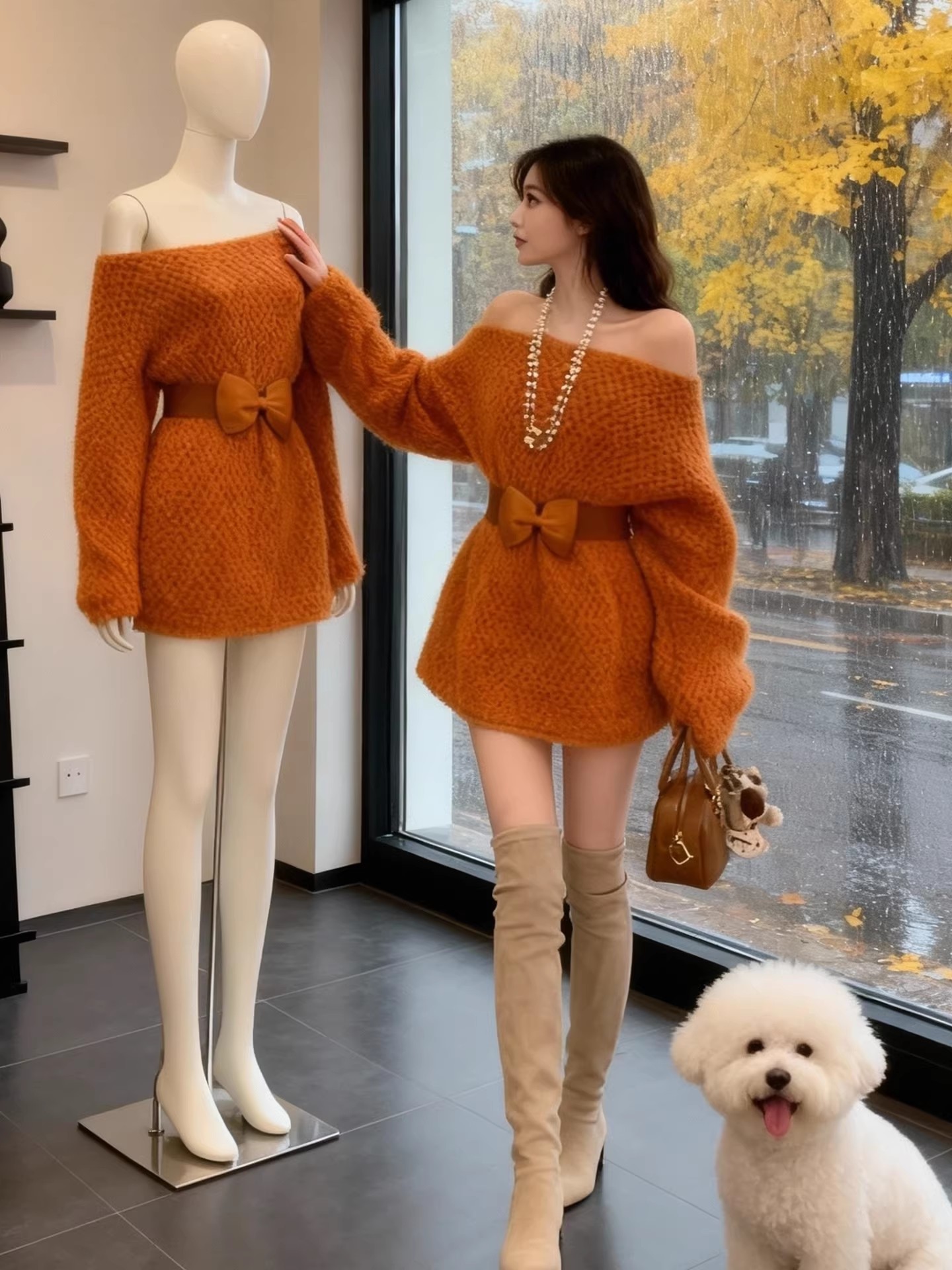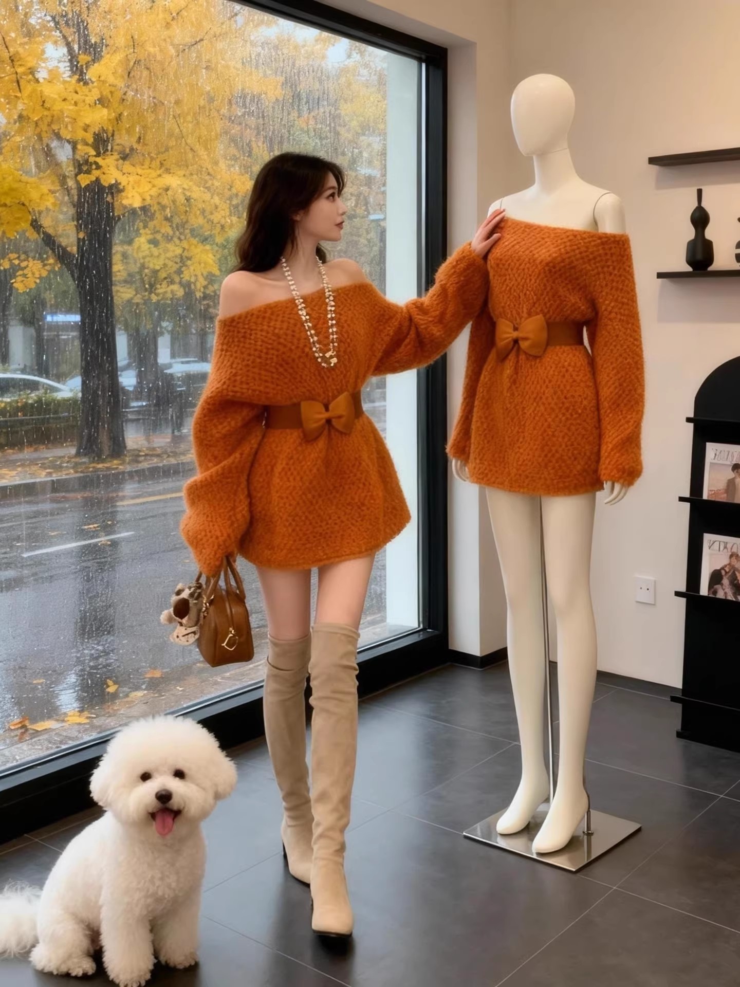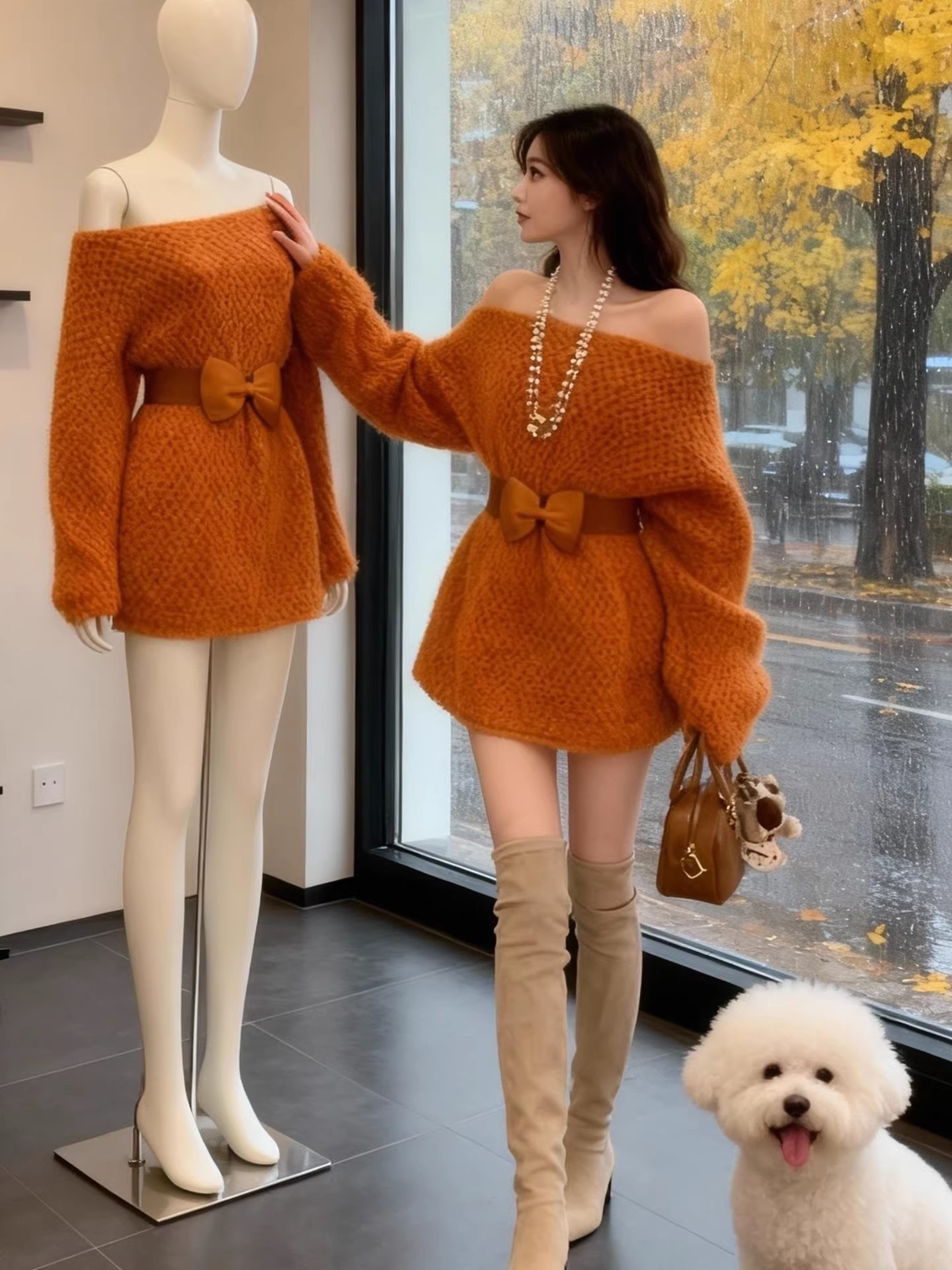 FA53155# 慵懒风露肩针织连衣裙女秋冬新款高级感宽松收腰显瘦加厚裙子 服裝批發女裝批發服飾貨源
