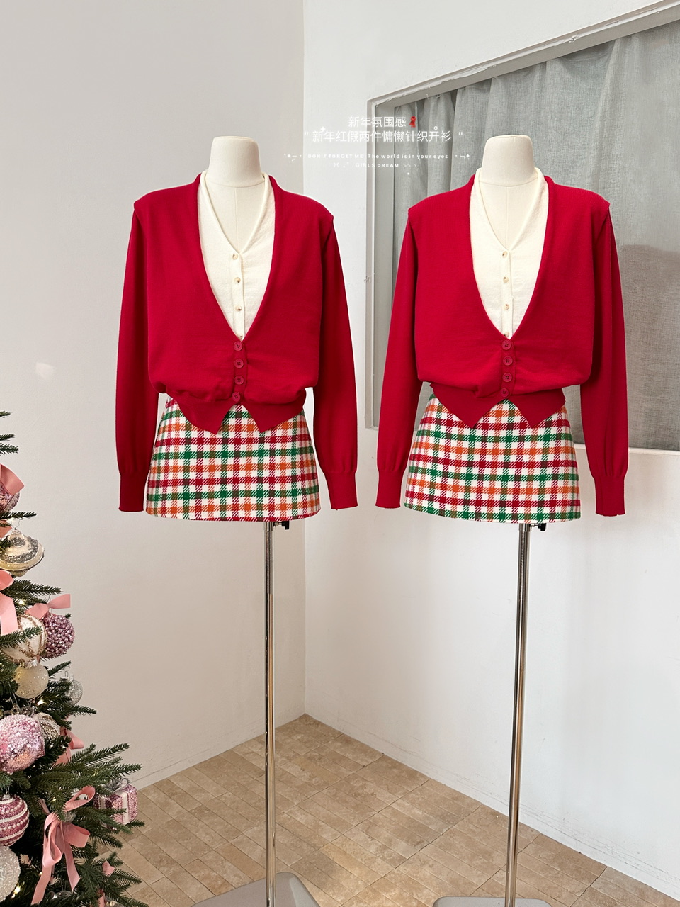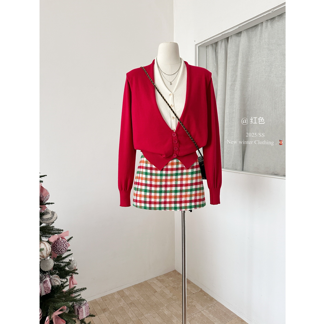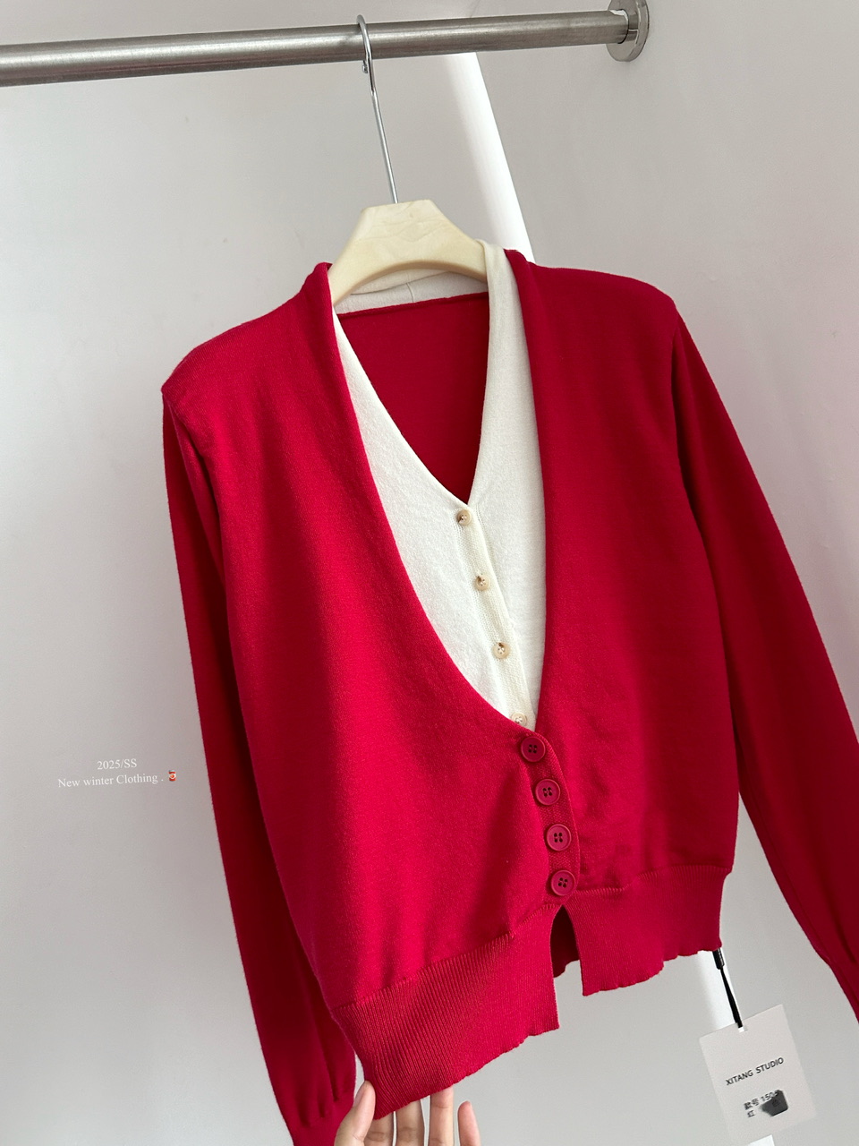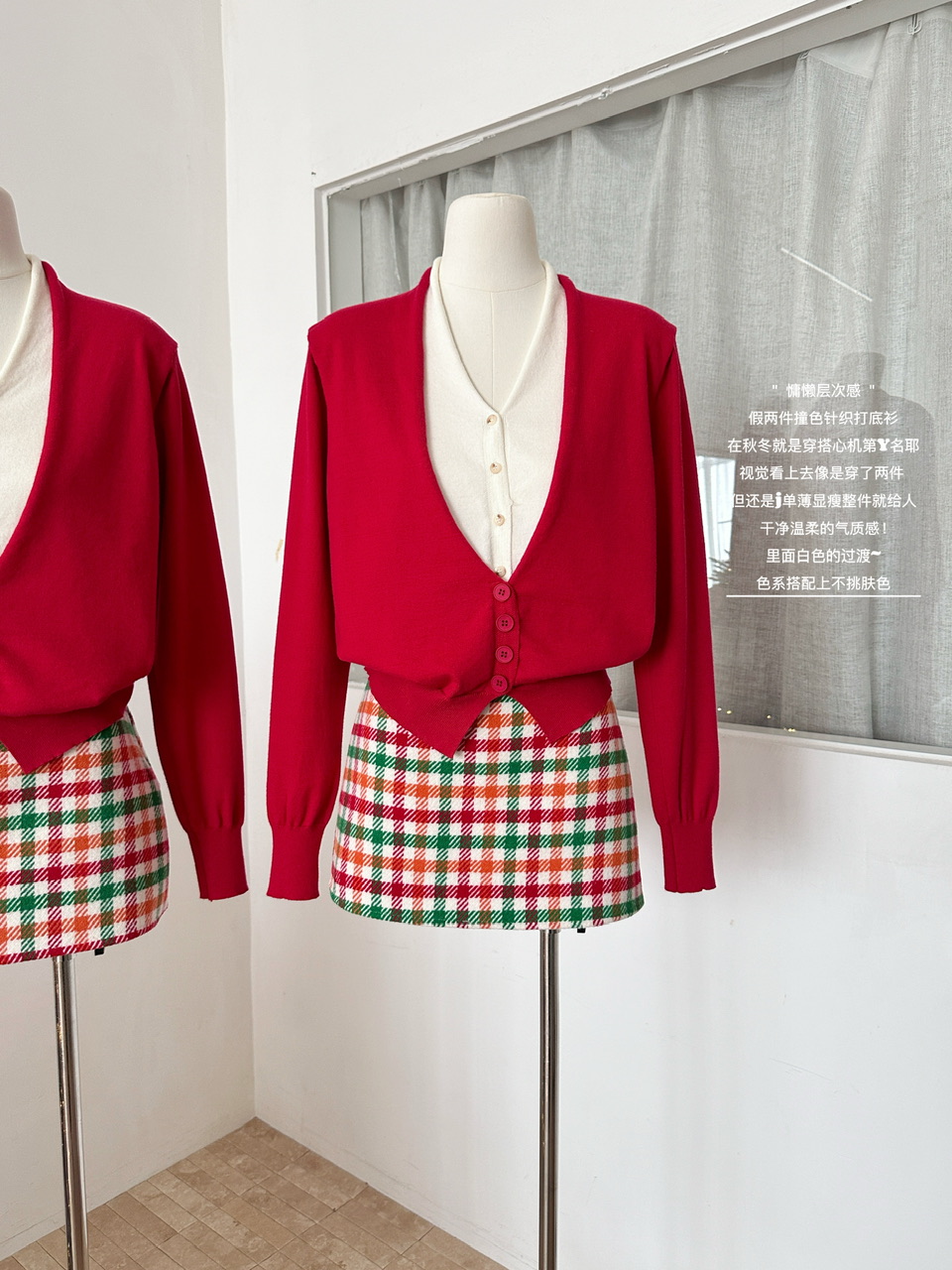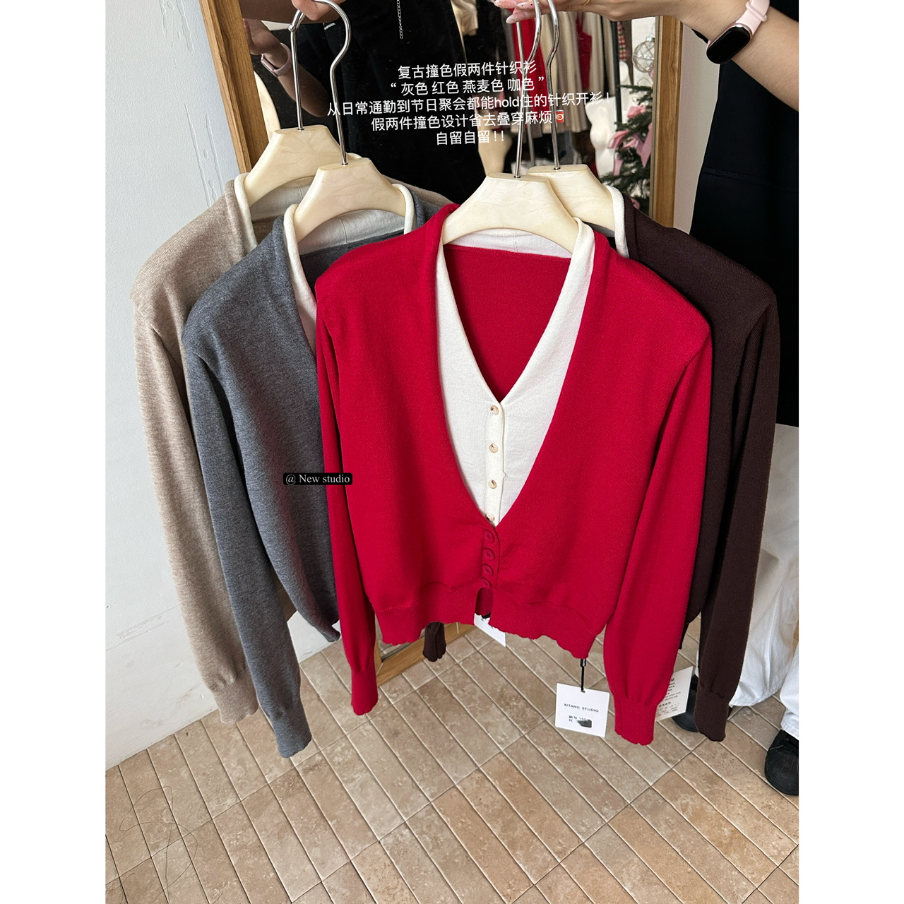 FA53163# 圣诞新年氛围感假两件V领针织开衫女秋冬款红色长袖通勤毛衣外套 服裝批發女裝批發服飾貨源
