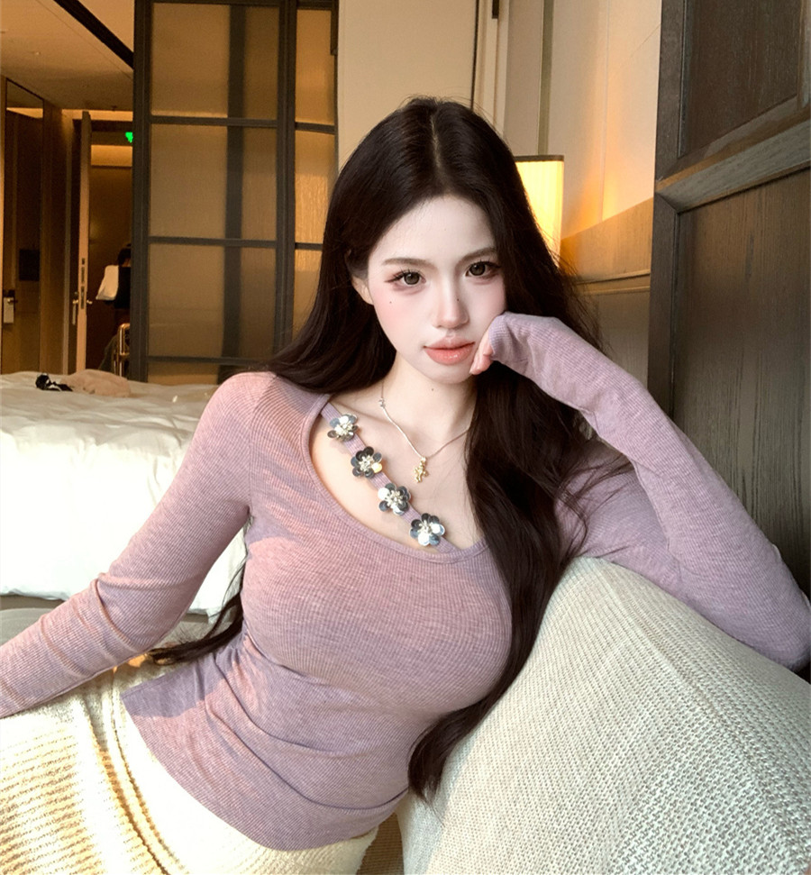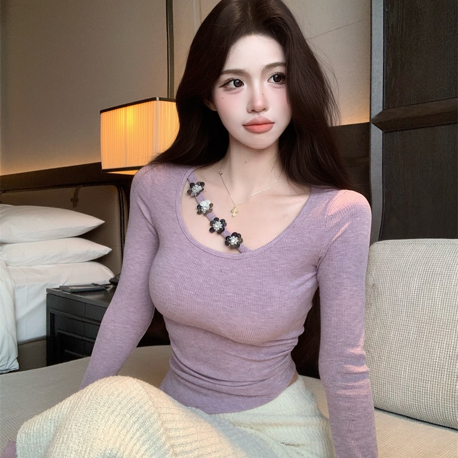 FA53317# 设计感性感U领不规则挂脖花朵钉珠皱褶修身显瘦打底T恤 服裝批發女裝批發服飾貨源