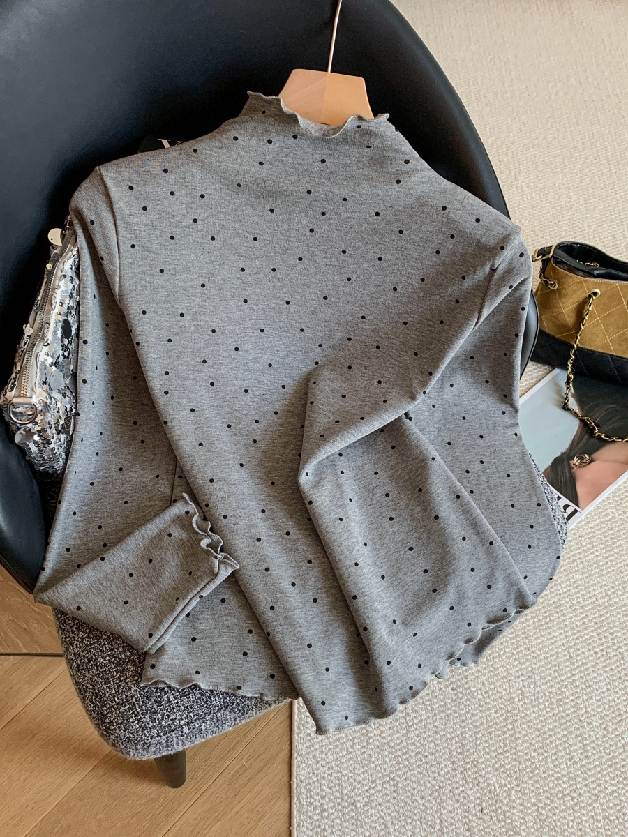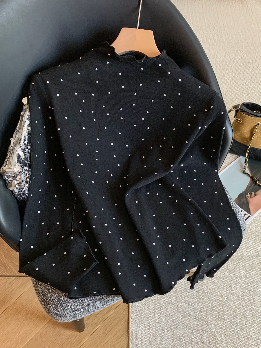 FA53327# 复古波点打底衫女内搭可外穿半高领木耳边修身长袖上衣 服裝批發女裝批發服飾貨源