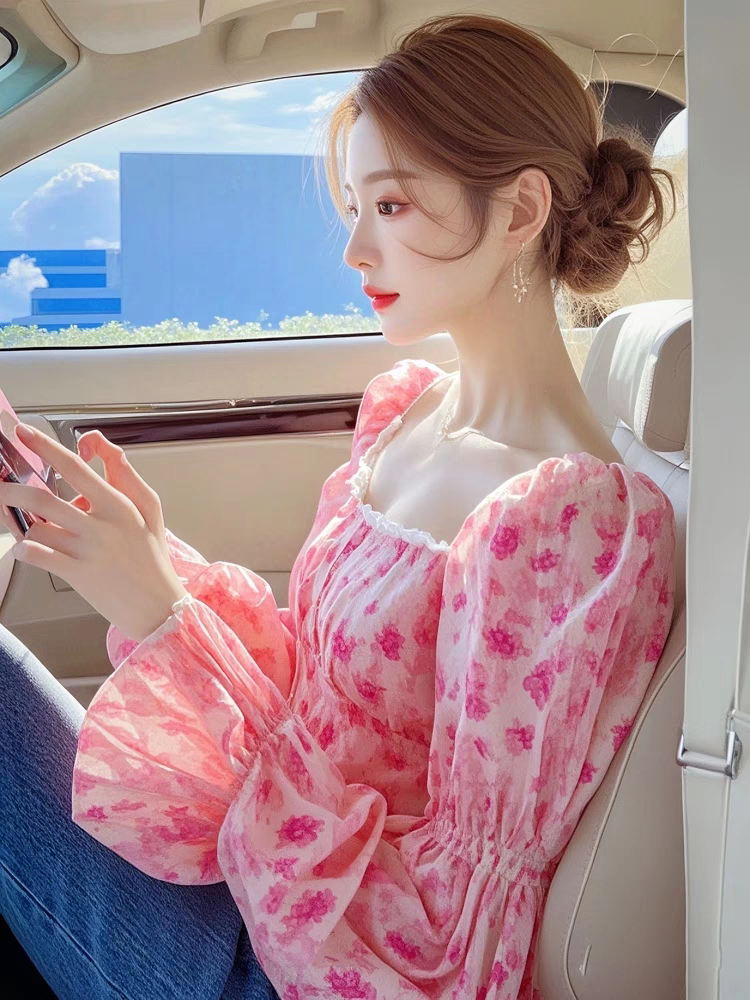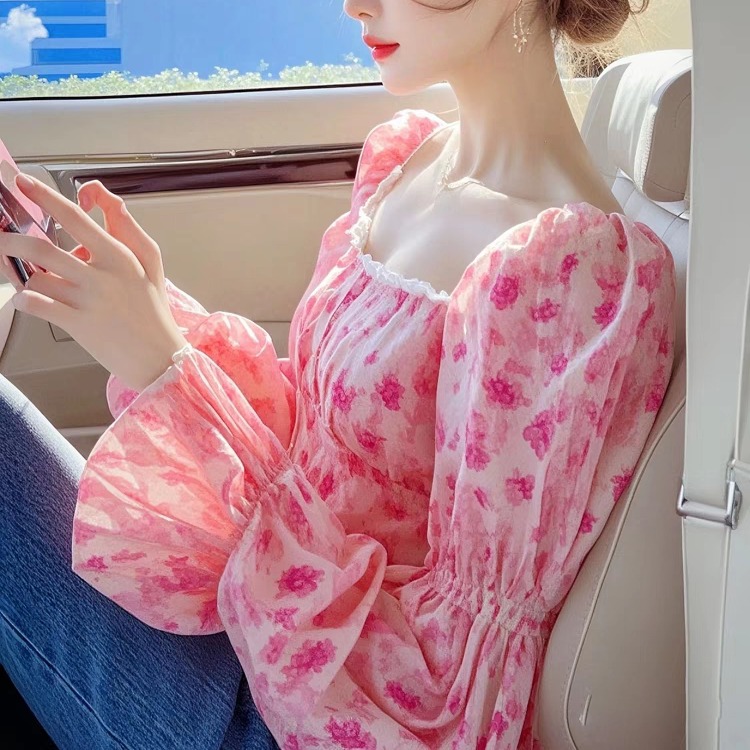 FA53335# 春季爆款高级感减龄洋气小众粉色印花长袖上衣 服裝批發女裝批發服飾貨源