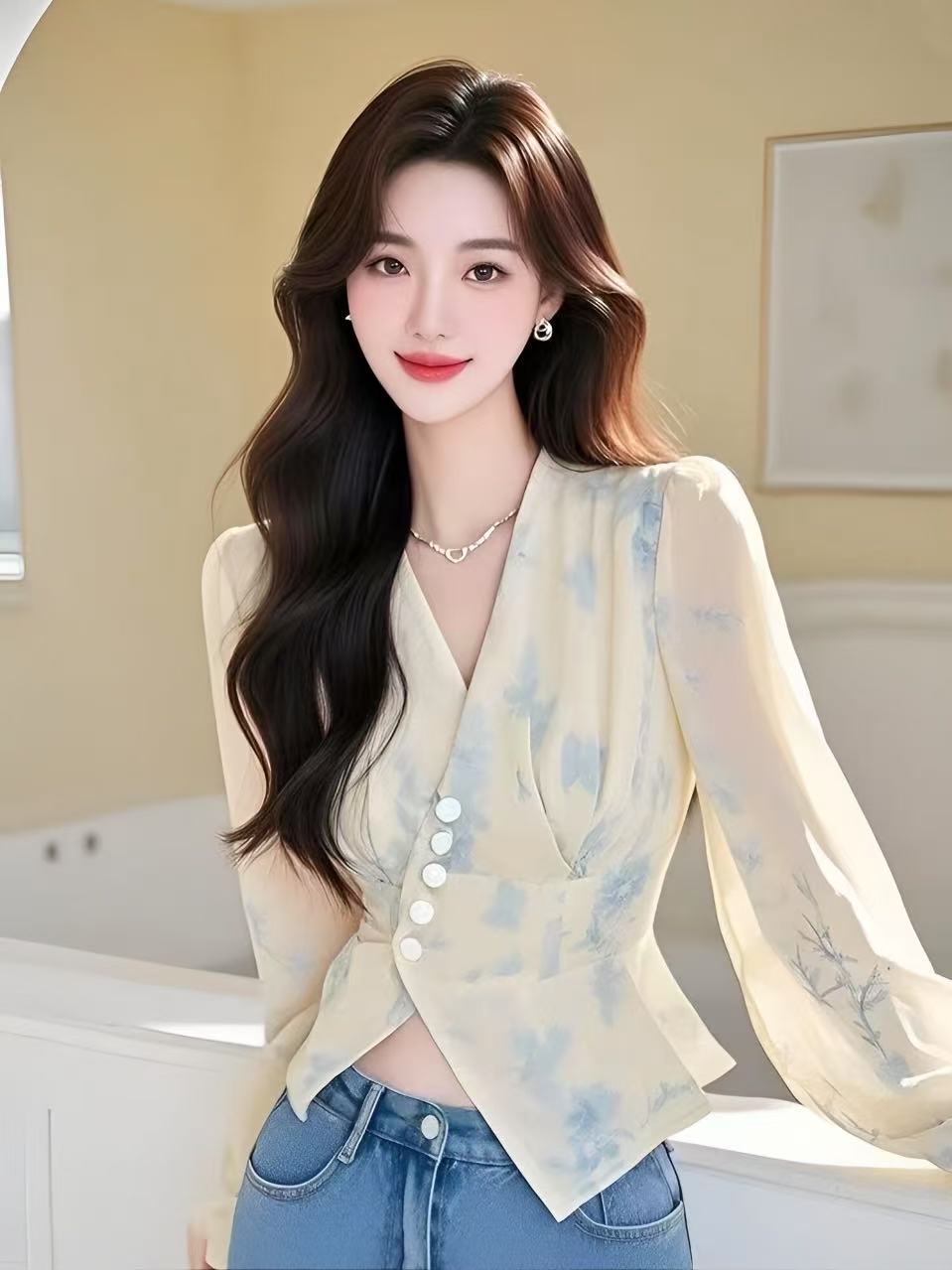 FA53336# 春秋季新款掐腰黄色v领碎花衬衫时尚洋气长袖上衣女 服裝批發女裝批發服飾貨源