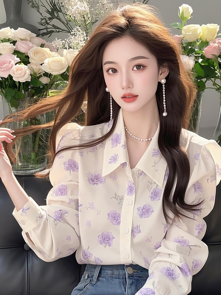 FA53339# 春秋季新款上衣女韩系长袖衬衣减龄洋气宽松印花衬衫 服裝批發女裝批發服飾貨源