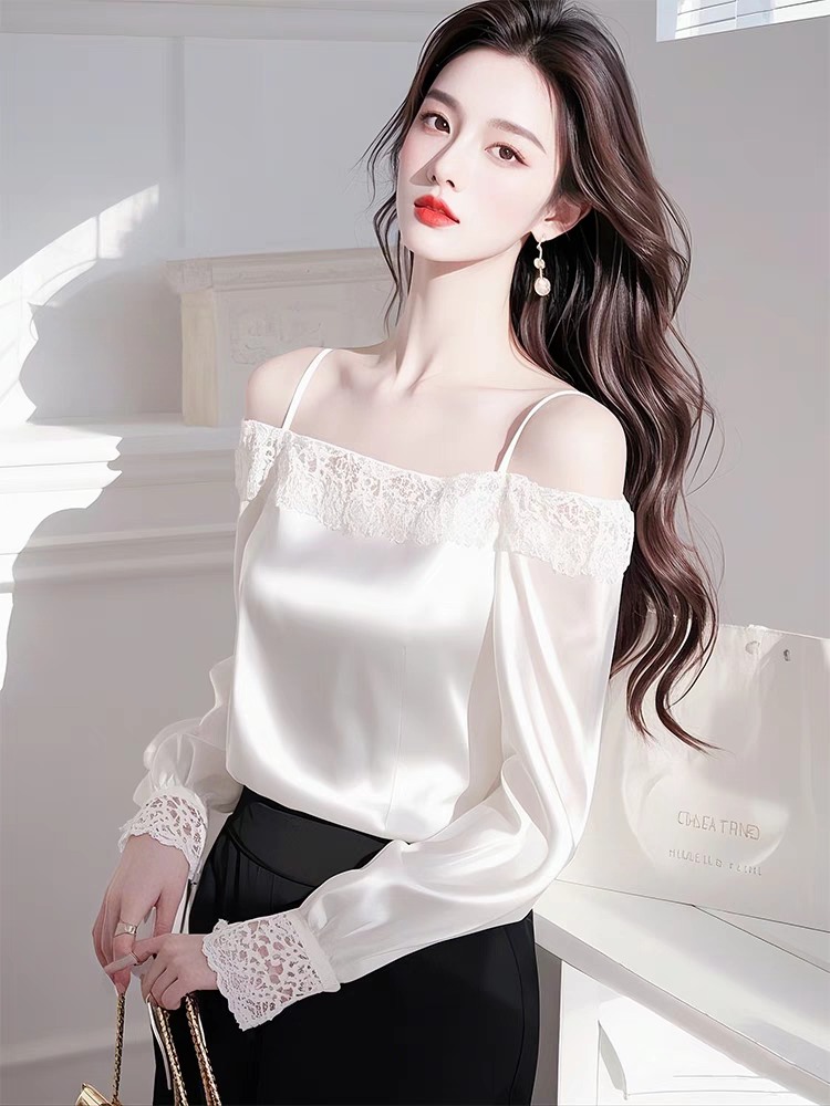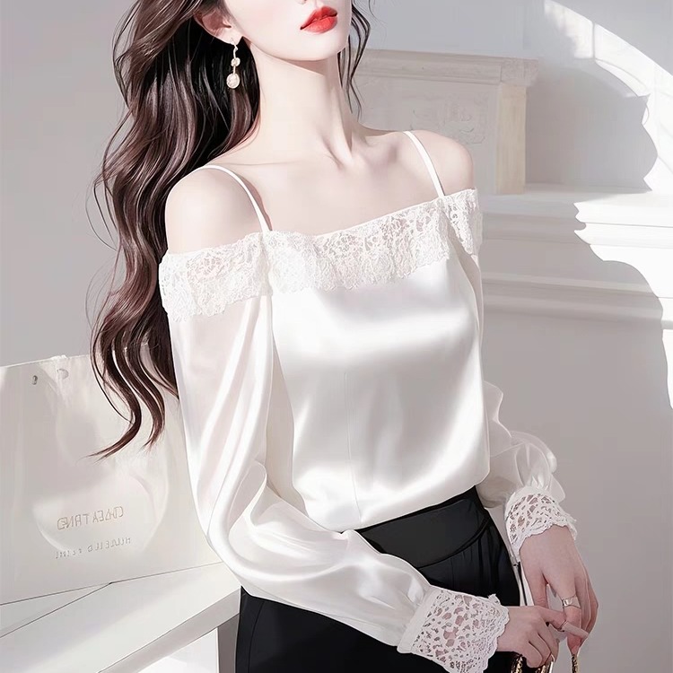 FA53340# 春秋季新款白色露肩缎面衬衫女收腰蕾丝拼接长袖上衣 服裝批發女裝批發服飾貨源