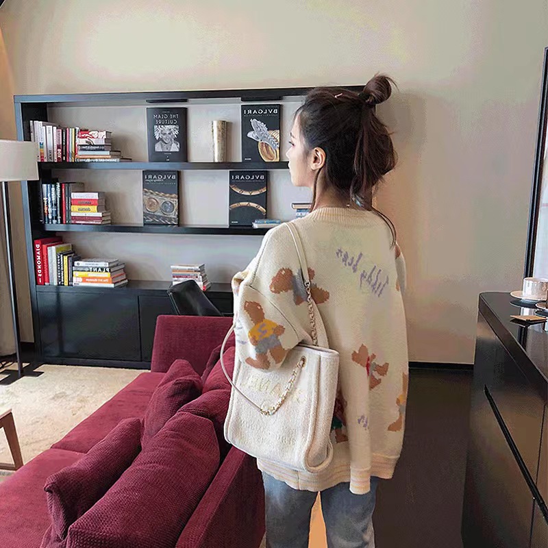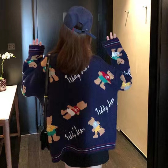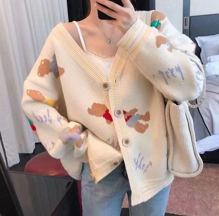 FA53360# 小熊针织开衫女春韩版宽松慵懒风V领毛衣外套中长款学院风 服裝批發女裝批發服飾貨源