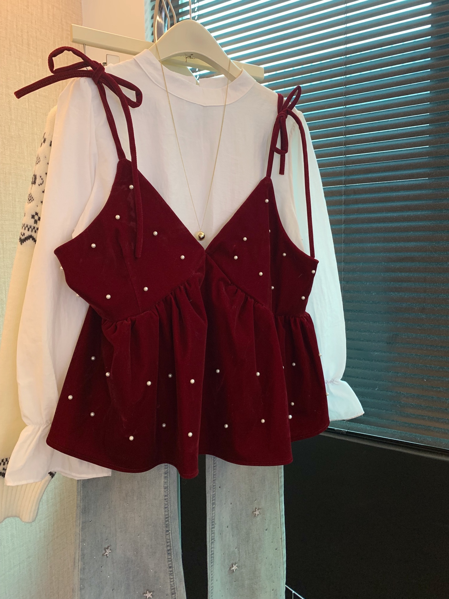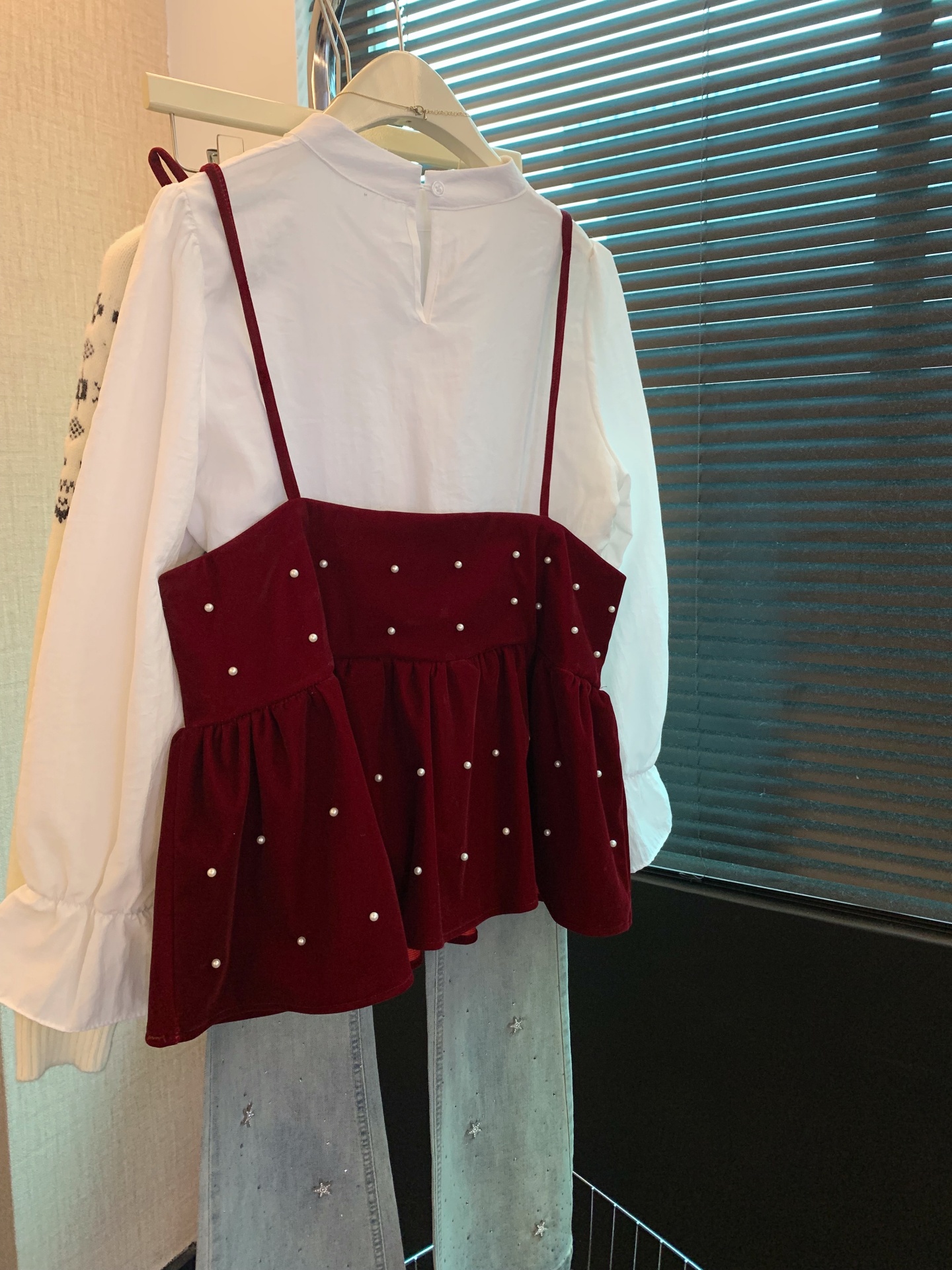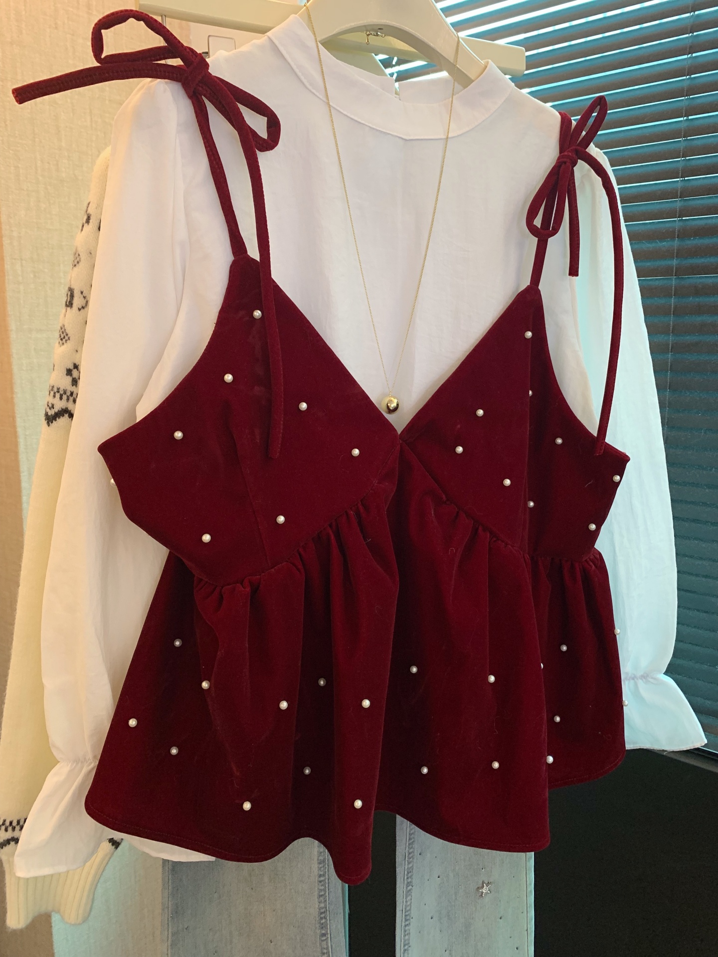 FA53396# 上甜美风长袖宽松衬衫女装春季叠穿系带珍珠背心两件套 服裝批發女裝批發服飾貨源