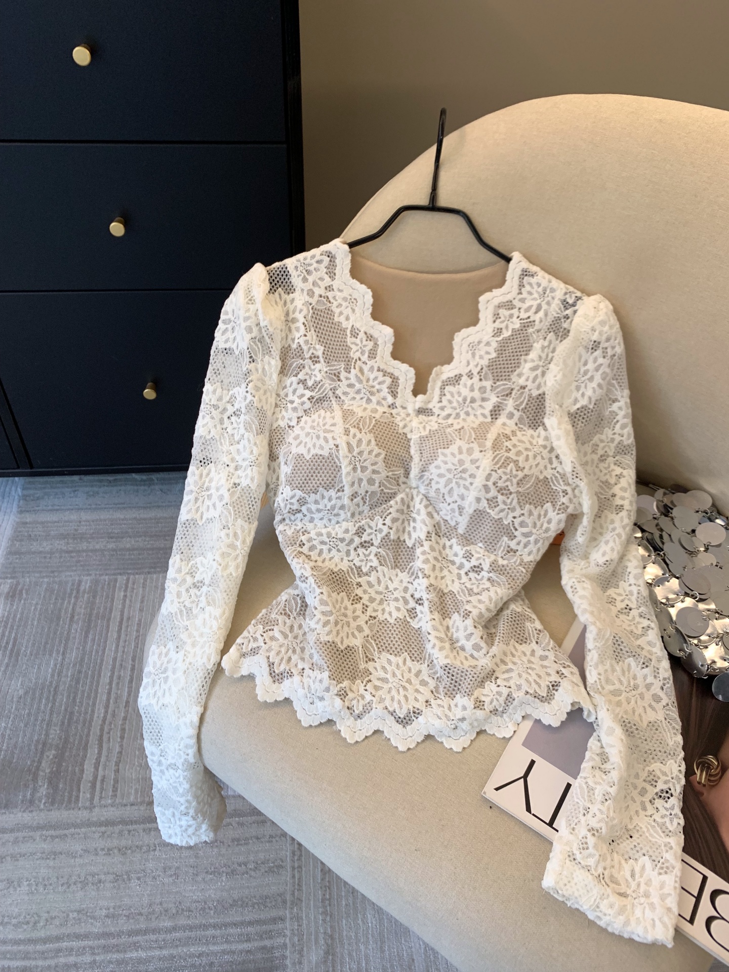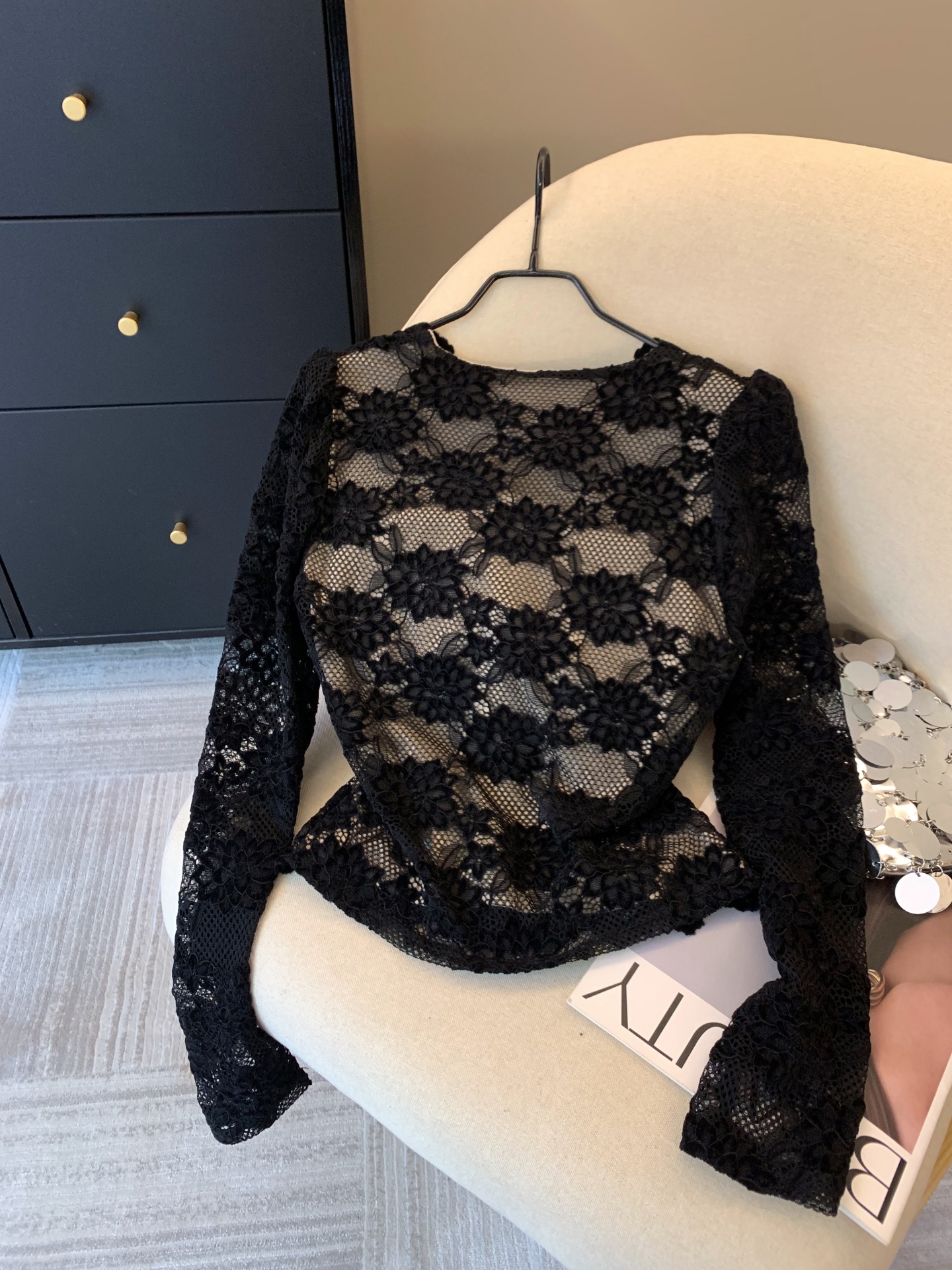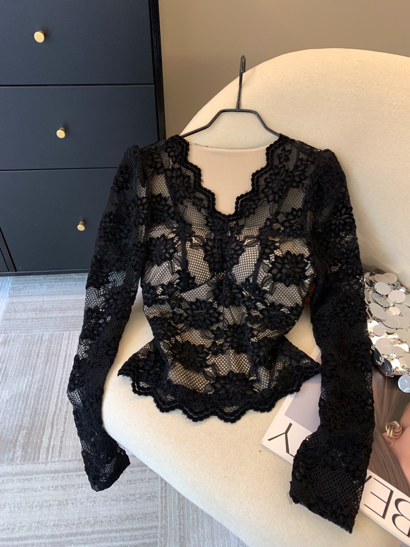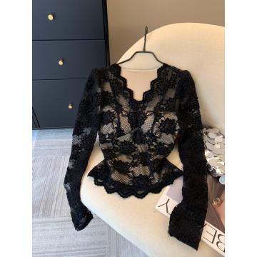 FA53404# 上高级感黑色V领蕾丝衫性感秋冬新款百搭时髦蕾丝上衣打底衫 服裝批發女裝批發服飾貨源