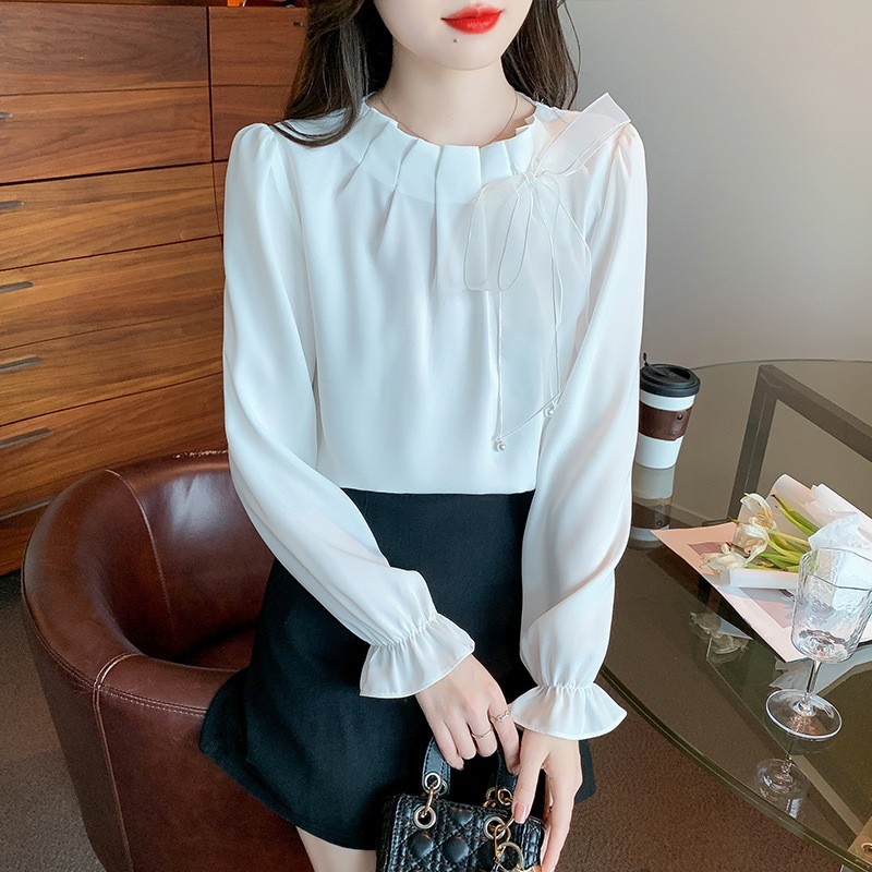 FA53497# 蝴蝶结长袖雪纺衬衫女26春秋新款显瘦百搭上衣时尚洋气小衫女