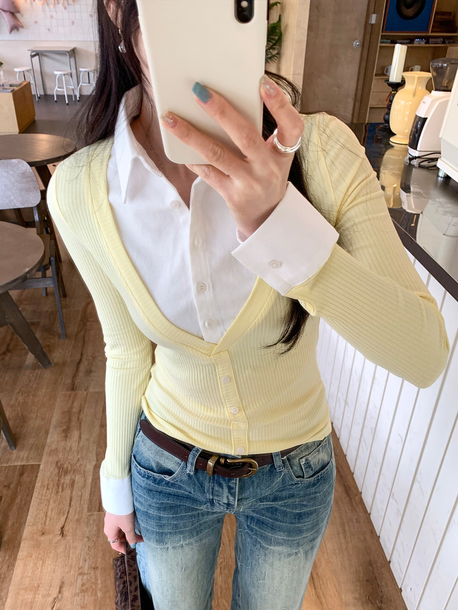FA53522# 图撞色拼接假两件翻领打底衫女秋冬新款超好看内搭小上衣