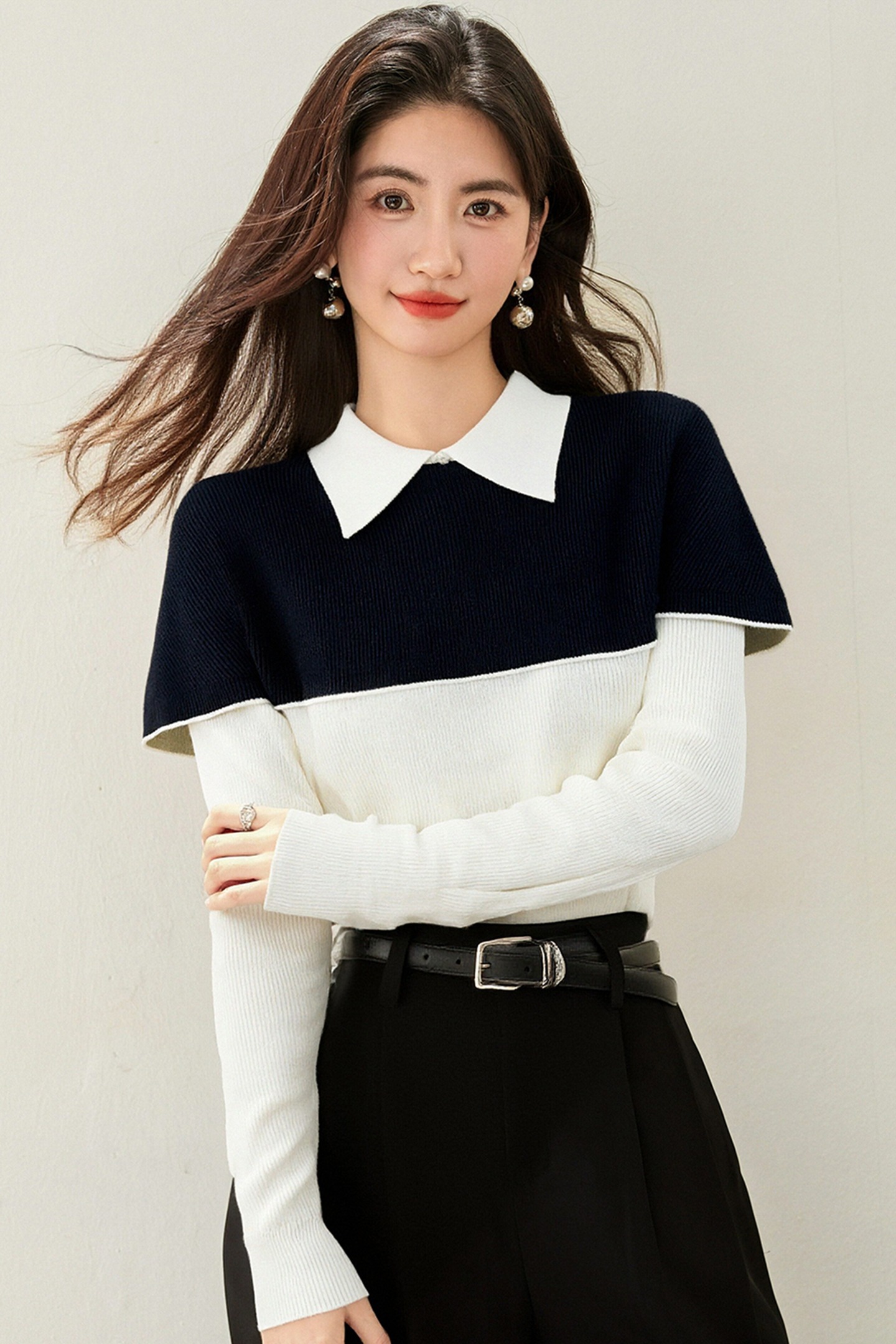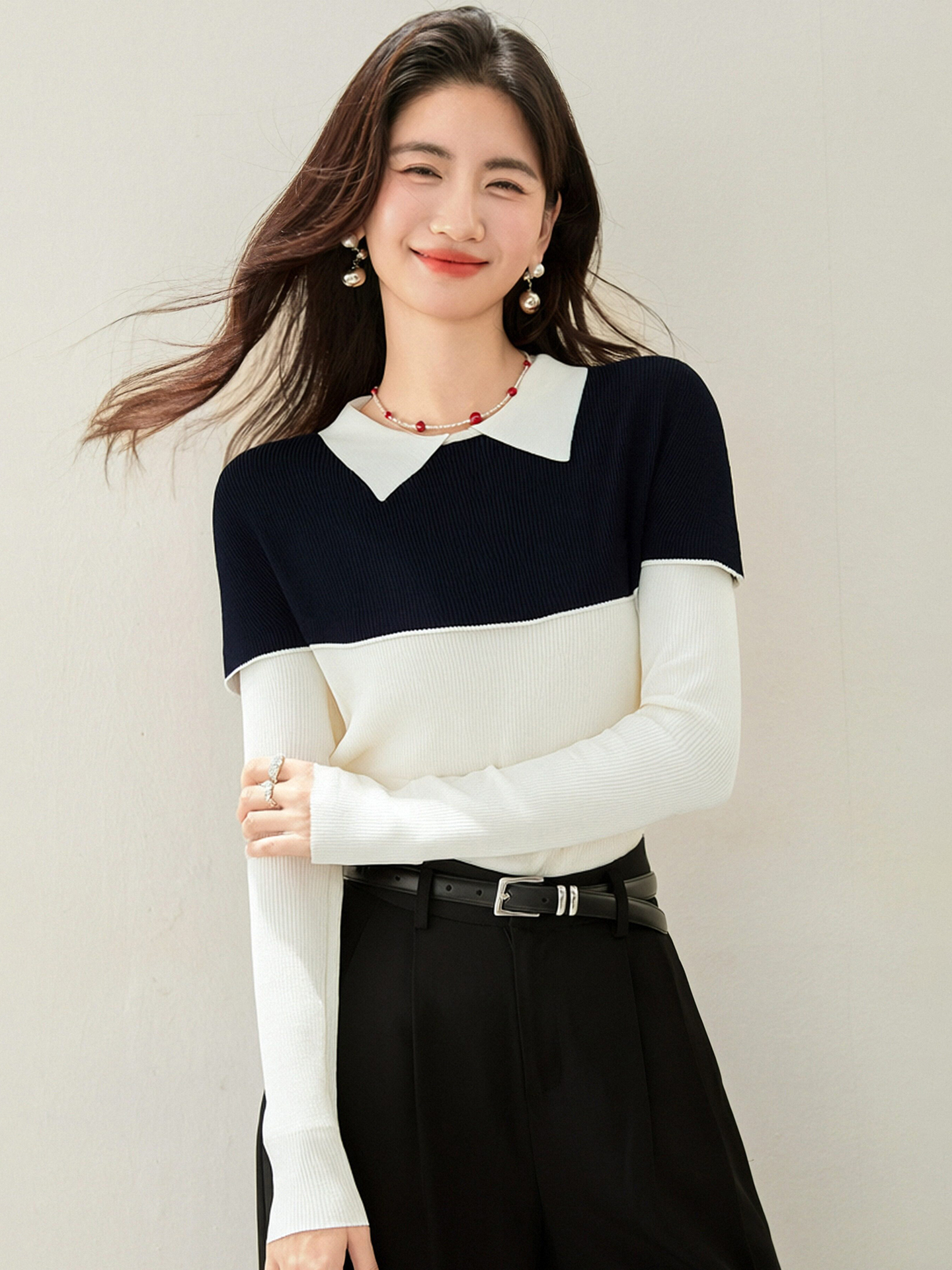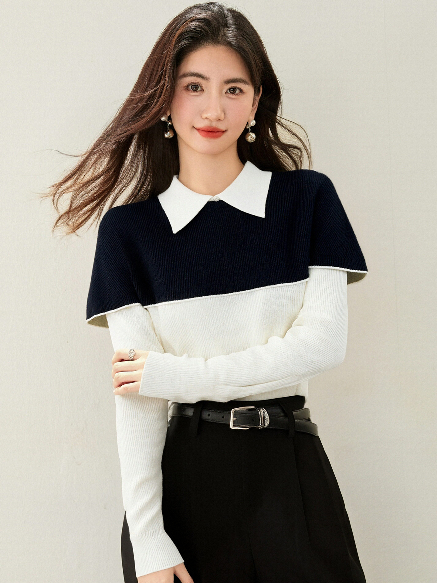 FA53543# 黑白撞色假两件polo领修身显瘦针织衫女新款秋冬小香风上衣