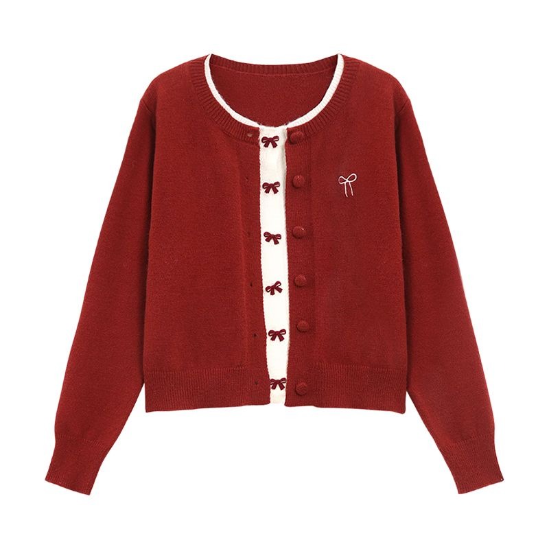 FA53556# 绵羊绒红色复古假两件毛衣开衫女秋冬减龄蝴蝶结刺绣针织衫外套