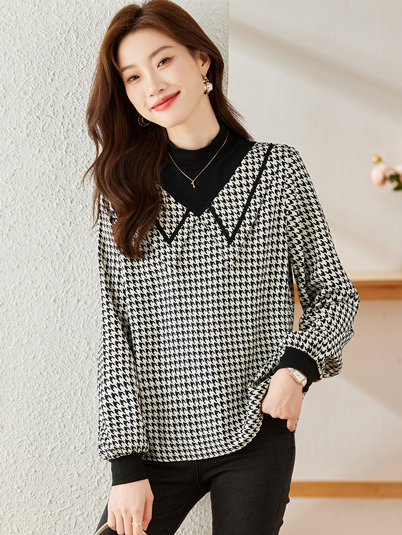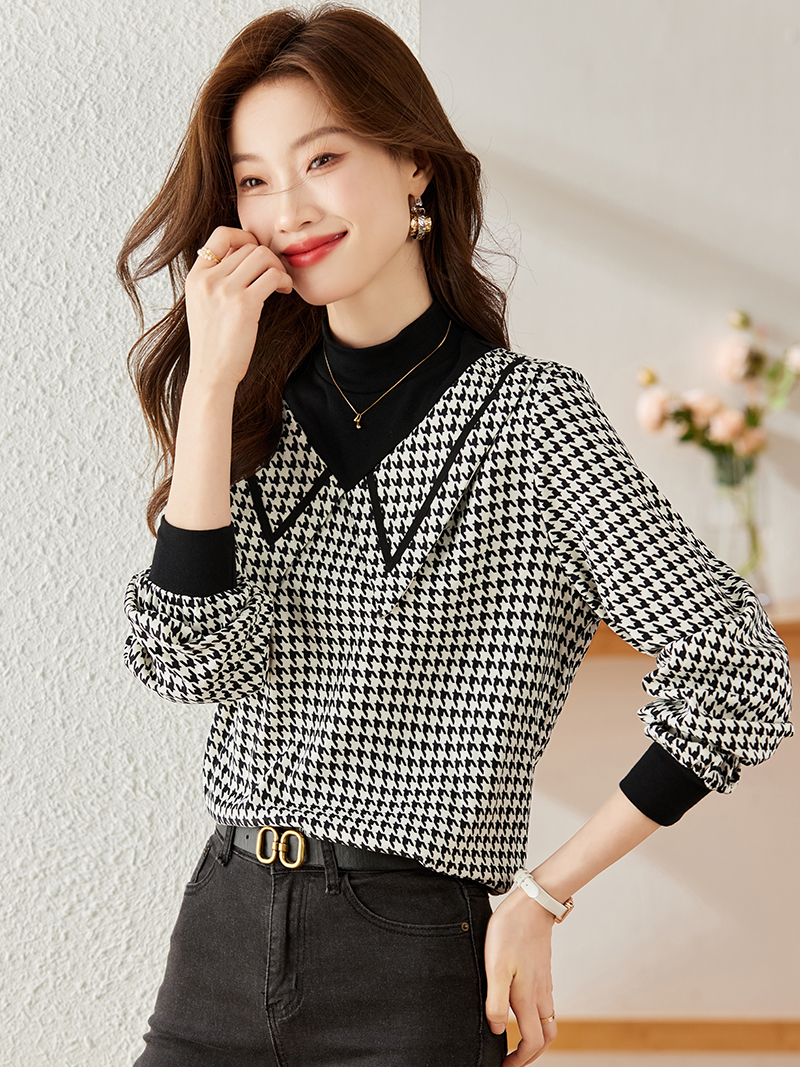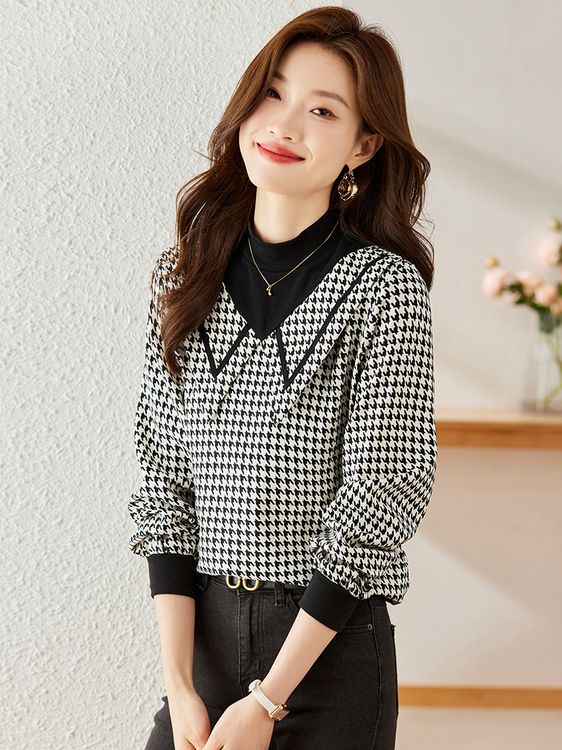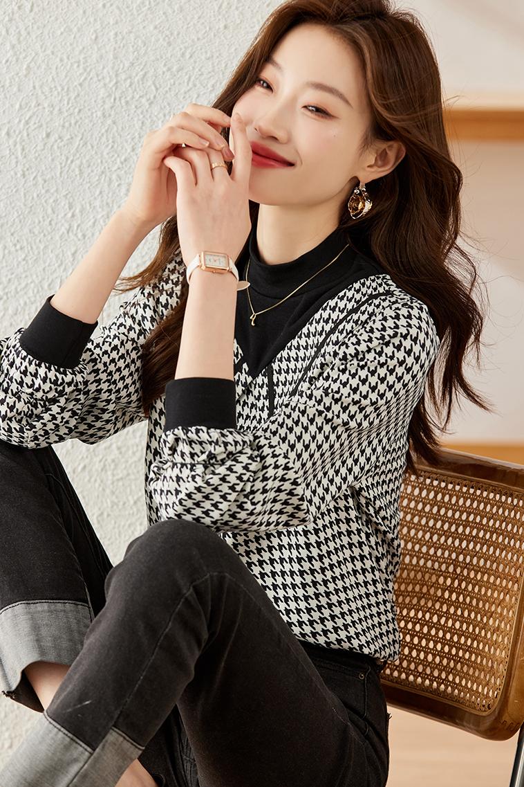 FA53631# 春款半高领上衣格子打底衬衫宽松假两件衬衣
