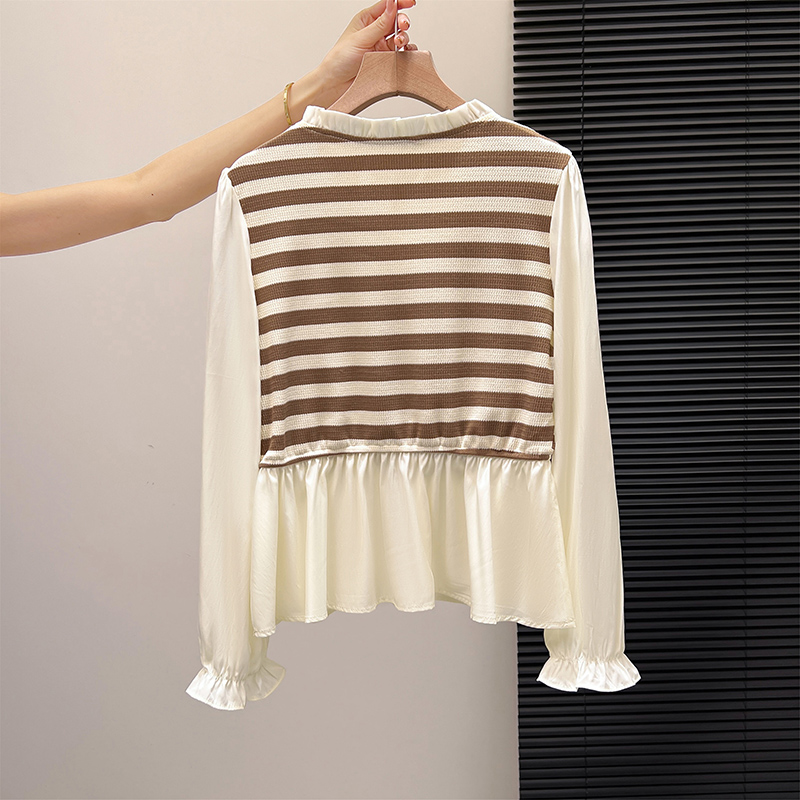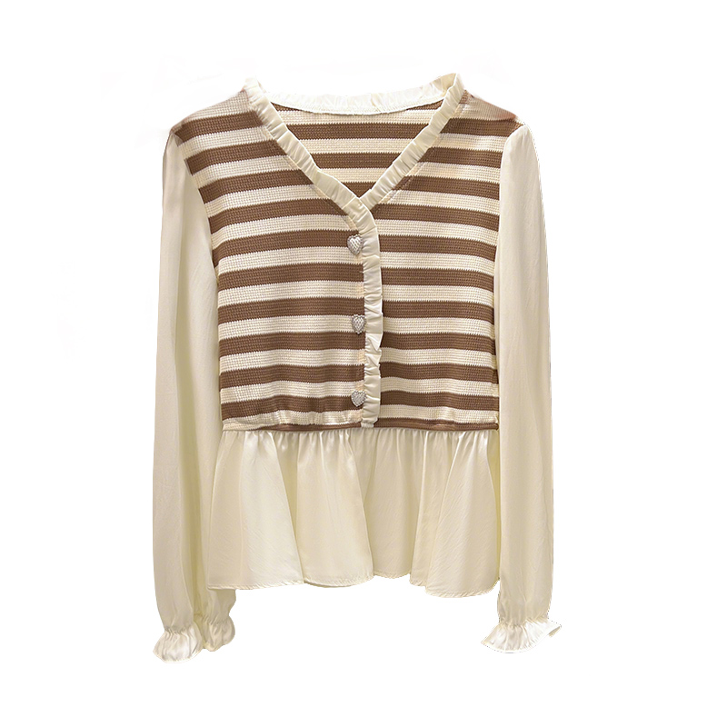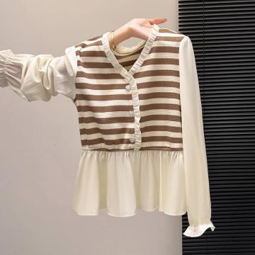 FA53721# 春装新款时尚洋气V领假两件拼接条纹长袖衬衫女收腰显瘦别致上衣 服裝批發女裝批發服飾貨源