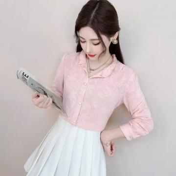 FA53778# 春季新款立领木耳边打底衫上衣复古通勤百搭长袖衬衫女提花 服裝批發女裝批發服飾貨源