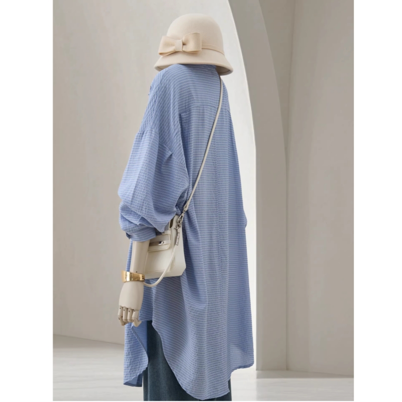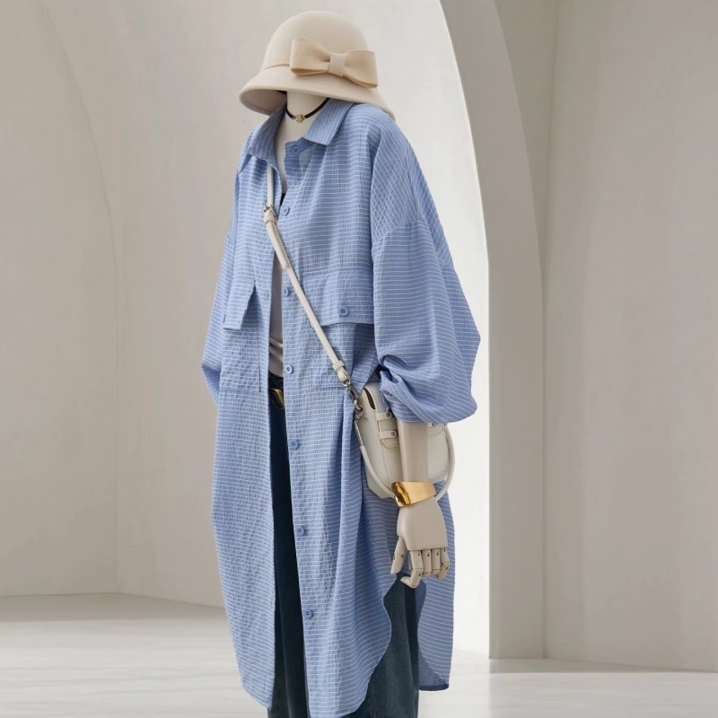 FA53931# 春季新款慵懒风肌理感空调衫中长款翻领长袖外搭条纹衬衫女 服裝批發女裝批發服飾貨源