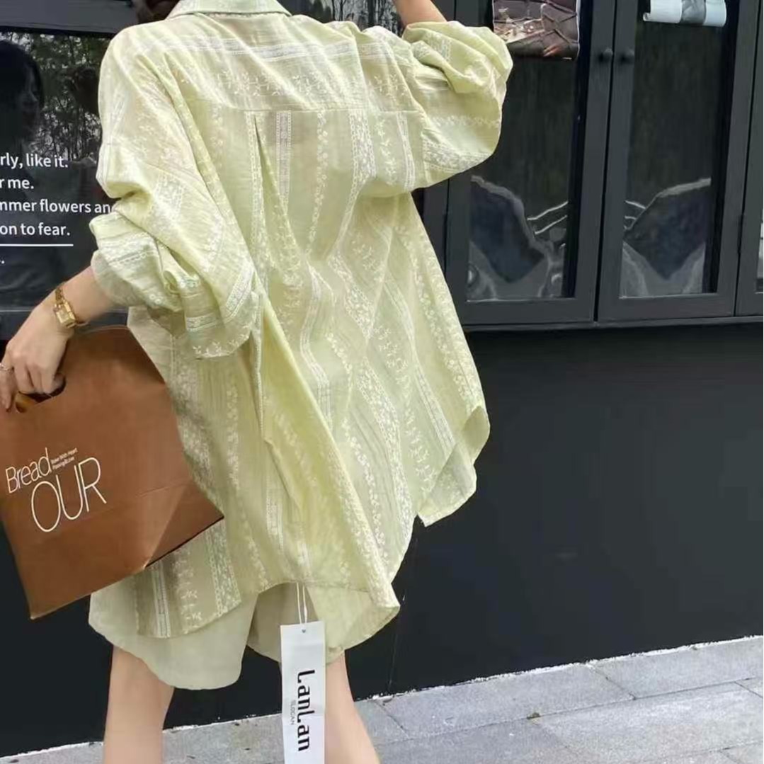 FA53954# 夏季花卉绣花条纹衬衫宽松设计感薄款原宿风衬衣休闲外套女 服裝批發女裝批發服飾貨源